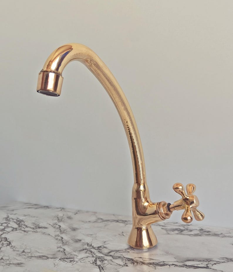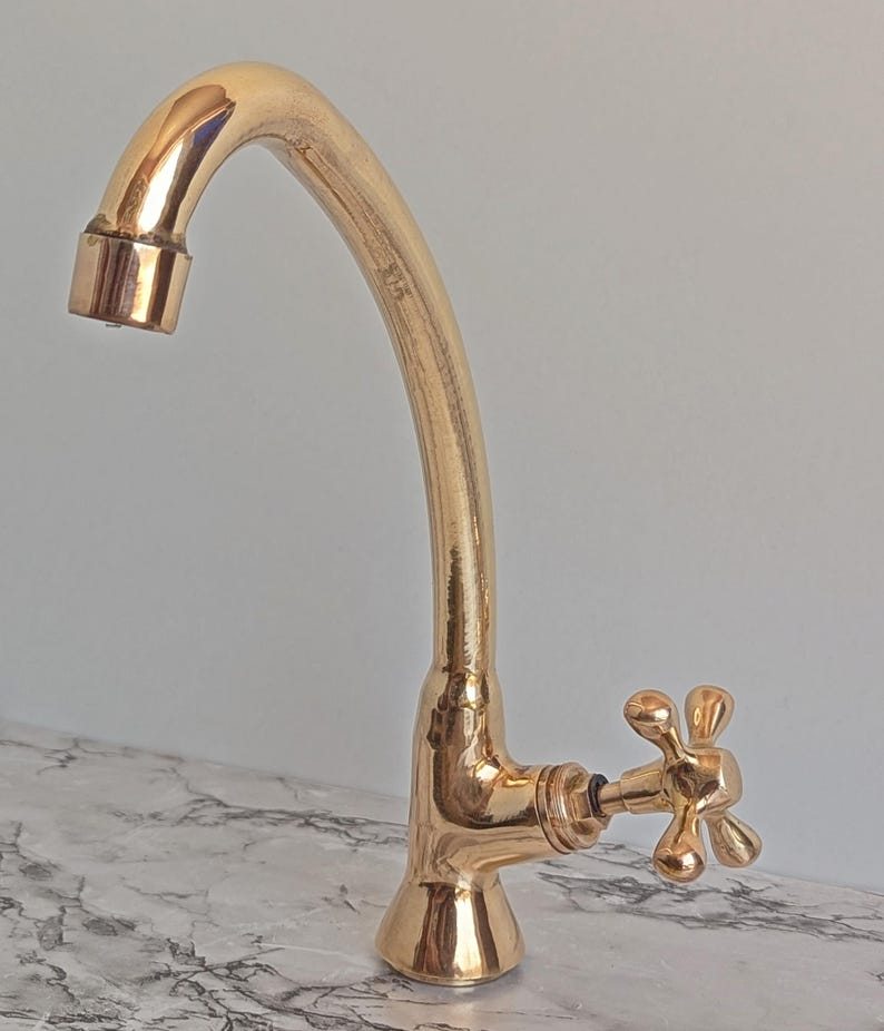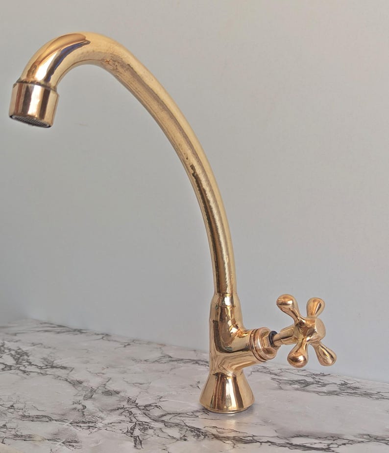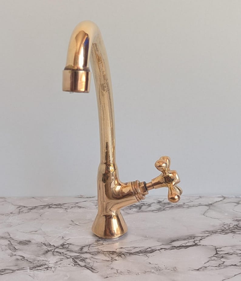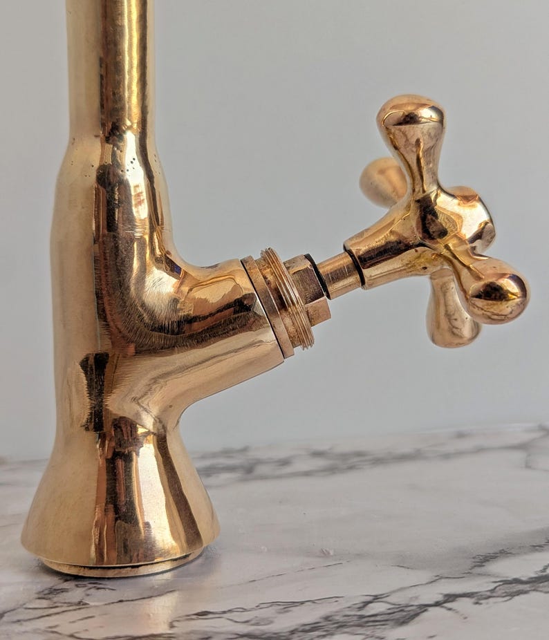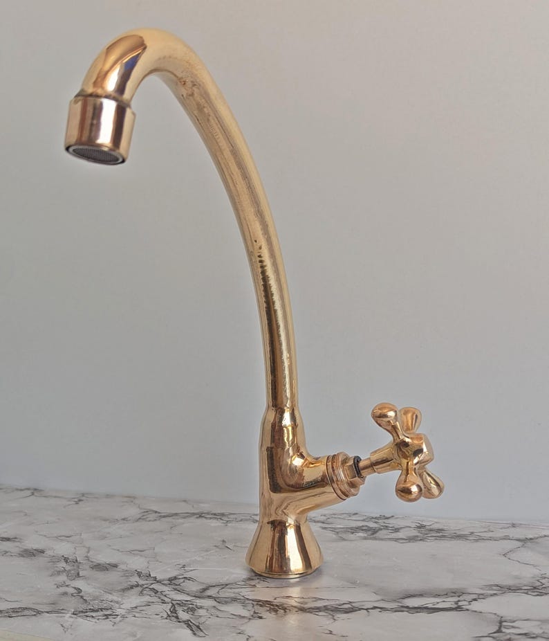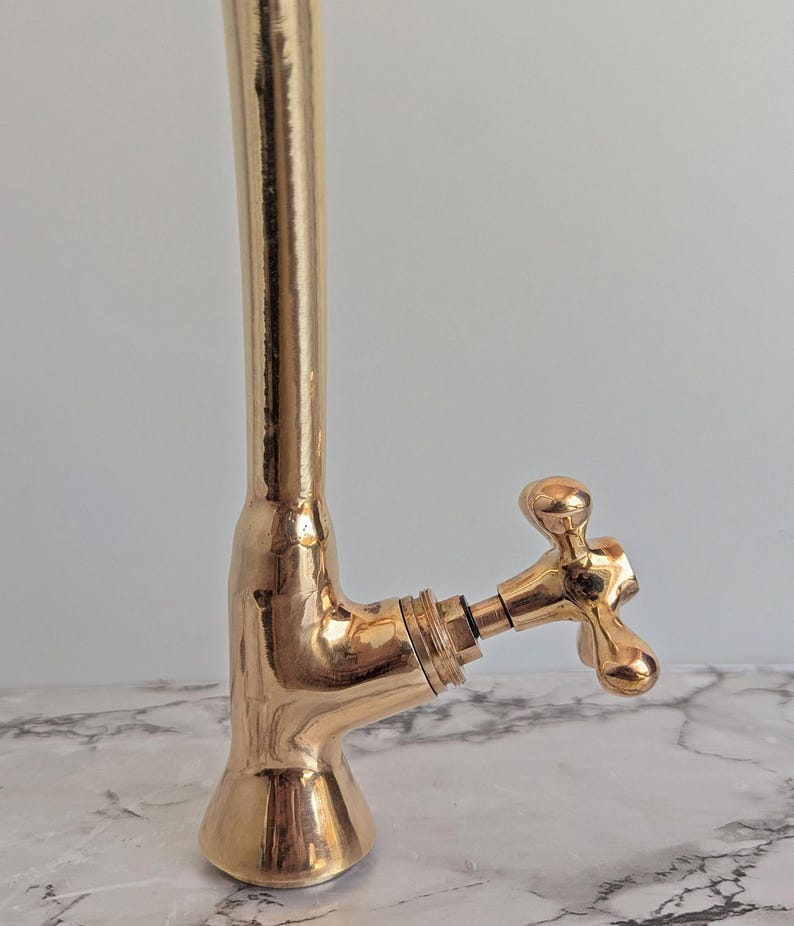 Transform your bathroom into a timeless space of artisan beauty with this handmade Moroccan brass faucet. Skillfully crafted by master artisans in Morocco, this faucet is a celebration of traditional craftsmanship, rich cultural heritage, and functional design. Made from 100% solid brass and finished by hand, each piece exudes a unique charm that can't be replicated by mass-produced fixtures.