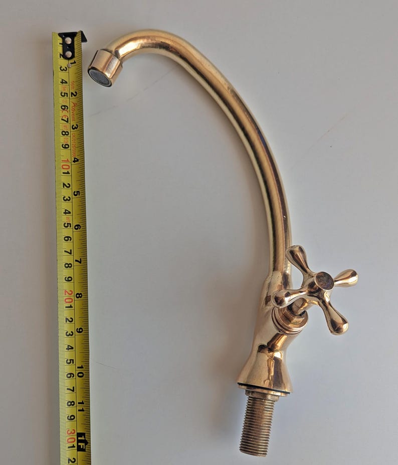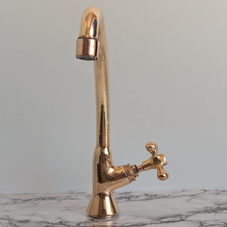 To maintain its natural beauty, simply wipe clean with a soft cloth. Avoid harsh chemicals or abrasives. As an unlacquered brass piece, the faucet will oxidize and darken over time—this is part of its charm! If desired, you can polish it to restore shine.
