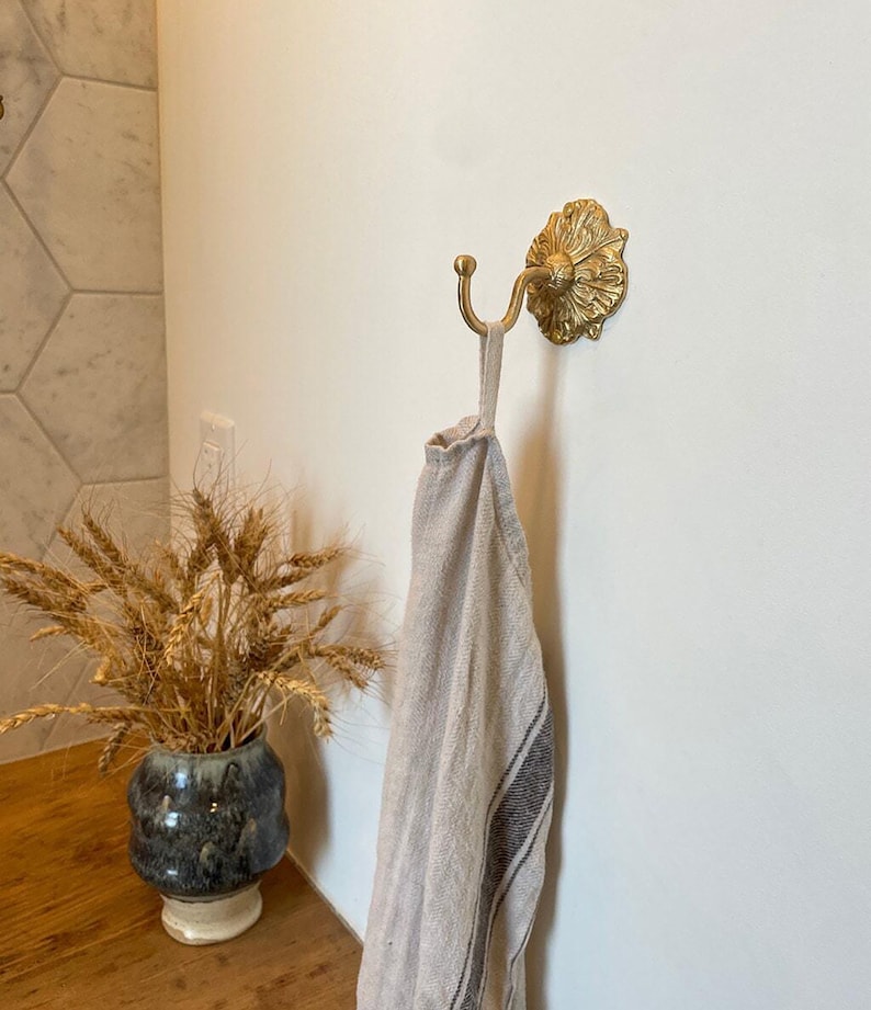 This handmade solid brass towel hanger is not only a functional piece but also adds a touch of elegance to your kitchen or bathroom decor. The towel rack features a sturdy design, perfect for holding towels, coats, or clothes. This towel hanger is a versatile and stylish addition to any space.