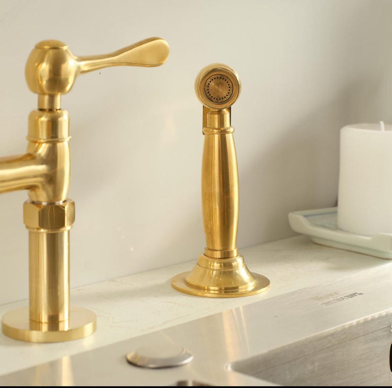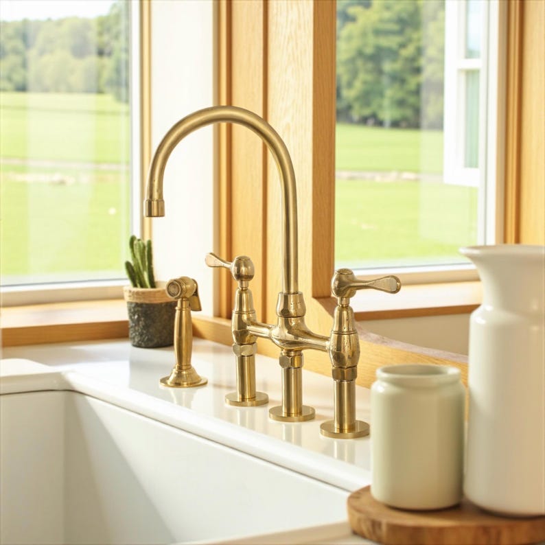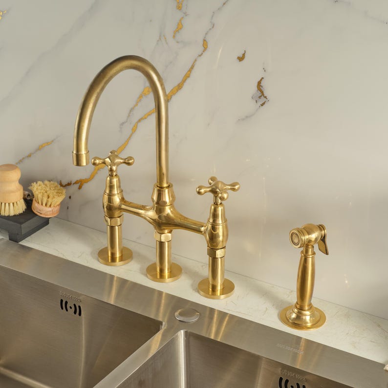 Unlacquered Brass 3 Hole Double Handle Bridge Kitchen Faucet with Side Sprayer & Cold Water Tap