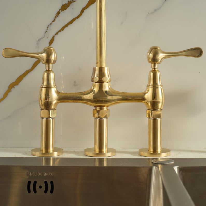 Bring timeless elegance to your kitchen with this Unlacquered Brass Double-Handle Bridge Faucet.