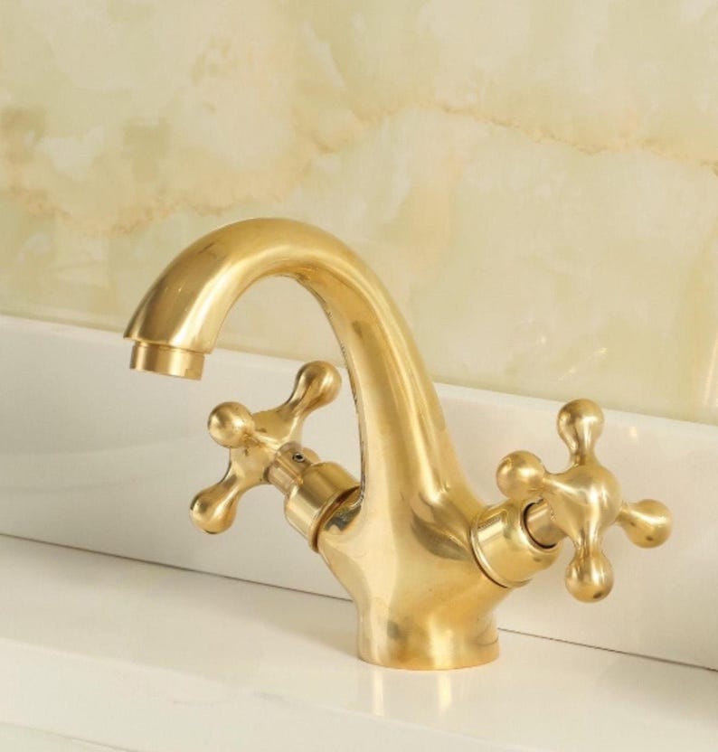 Elevate your bathroom with this Unlacquered Brass deck-mounted, single-hole faucet featuring classic cross handles. Crafted from premium solid brass, it boasts a natural raw finish that gracefully develops a warm patina over time, giving it a unique vintage charm that becomes even more beautiful with use.