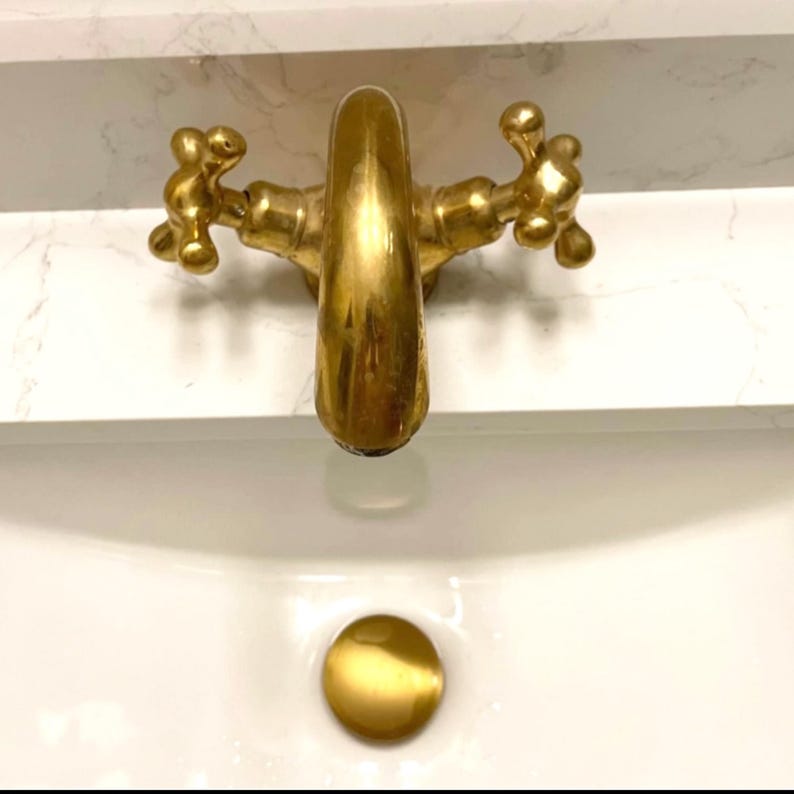 Unlacquered Brass Bathroom Faucet: Single Hole, Cross Handles, Pop-Up Drain