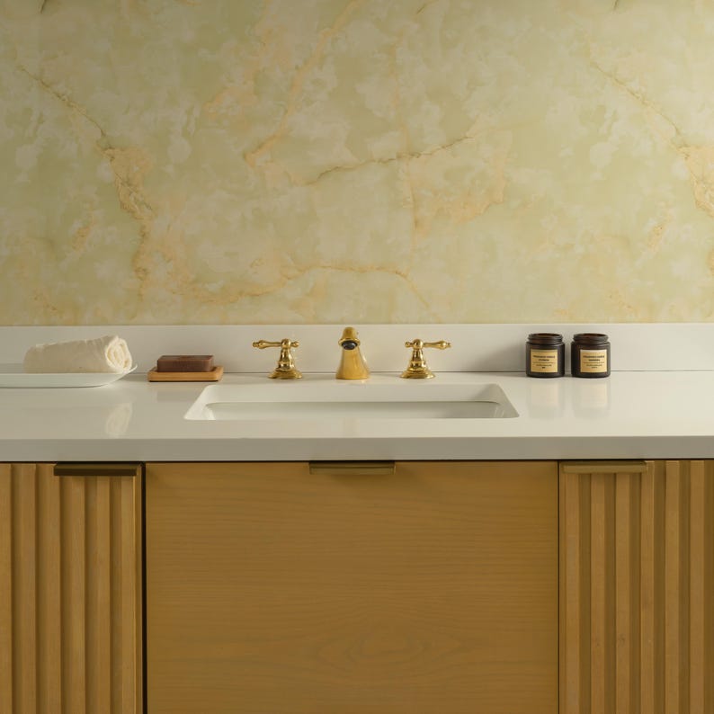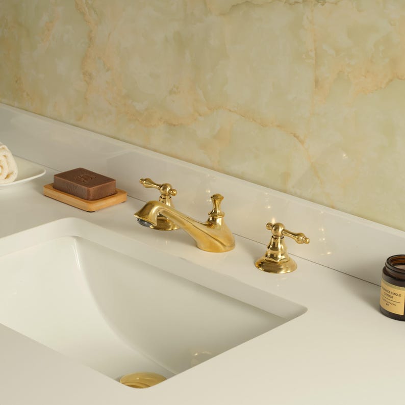 Crafted from unlacquered solid brass, this two-handle widespread faucet (8”–16” deck mount, 3-hole installation) brings timeless elegance and durability to your bathroom. The natural living finish develops a beautiful patina over time, enhancing its authentic charm.