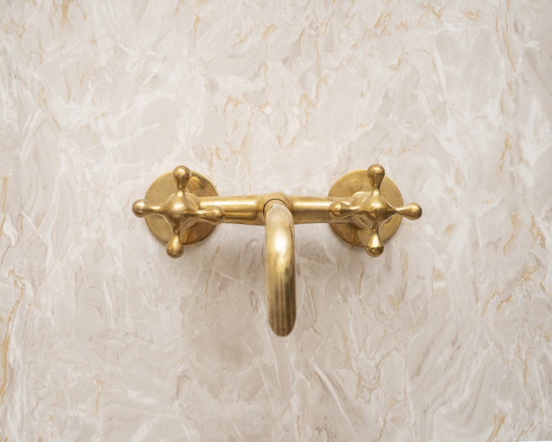 With our wall-mounted bathroom faucet with cross handles, solid brass tub filler faucet, and unlacquered brass bathroom sink faucet, you can turn your bathroom into an outstanding bathroom design. This handcrafted vanity faucet is the ideal accent to your bathroom decor since it blends elegance, practicality, and longevity. This gorgeous bathroom fixture will provide a touch of class and timeless appeal to any area.