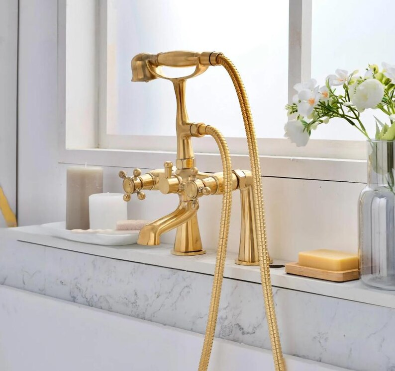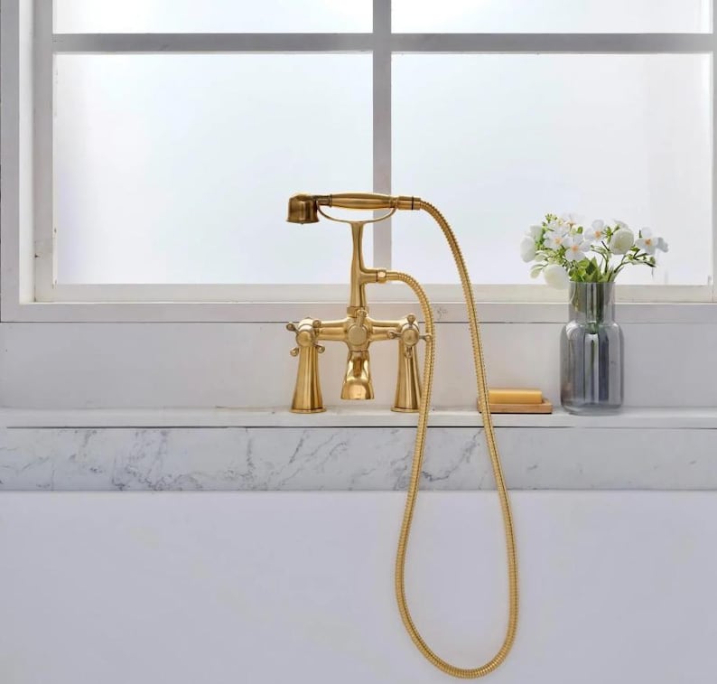 Unlacquered Brass Deck Mount Tub Faucet with Hand Shower