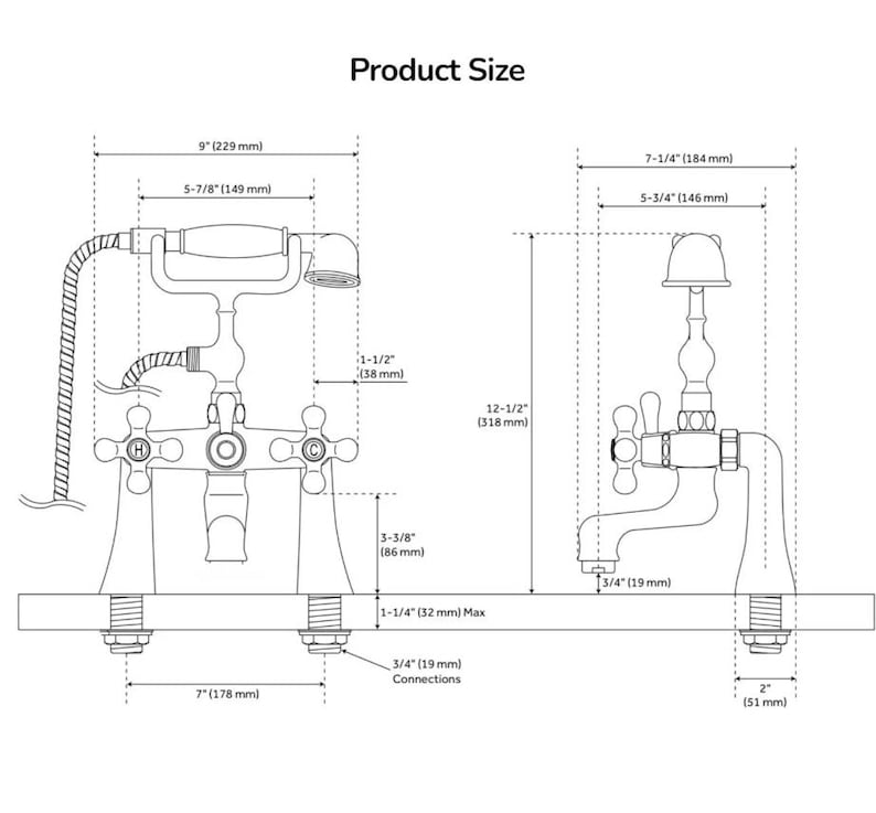 This faucet features an elegant, vintage-inspired design with cross handles that allow precise control of water flow and temperature, while the center lever lets you easily switch between the tub spout and hand shower. Designed for installation on the tub rim, it combines comfort, elegance, and enduring durability.