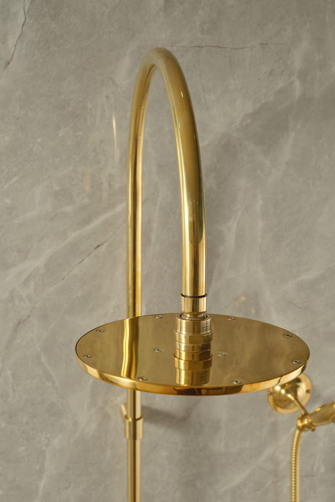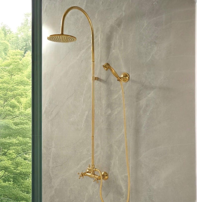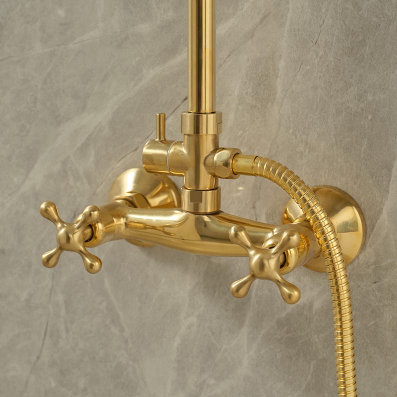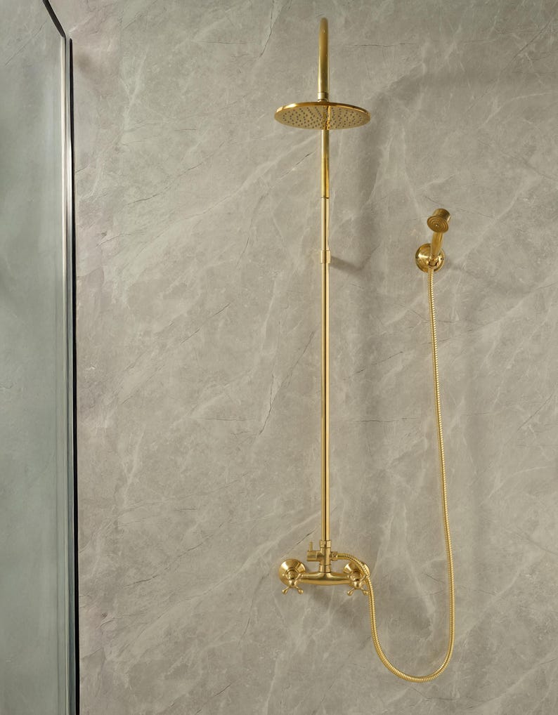Wash away the stress of your daily routine with this elegant wall-mounted shower crafted from solid unlacquered brass. Designed with a classic exposed pipe and vintage-style cross handles, it combines timeless beauty with reliable performance. The raw brass finish naturally develops a warm, unique patina over time, adding character to your bathroom.