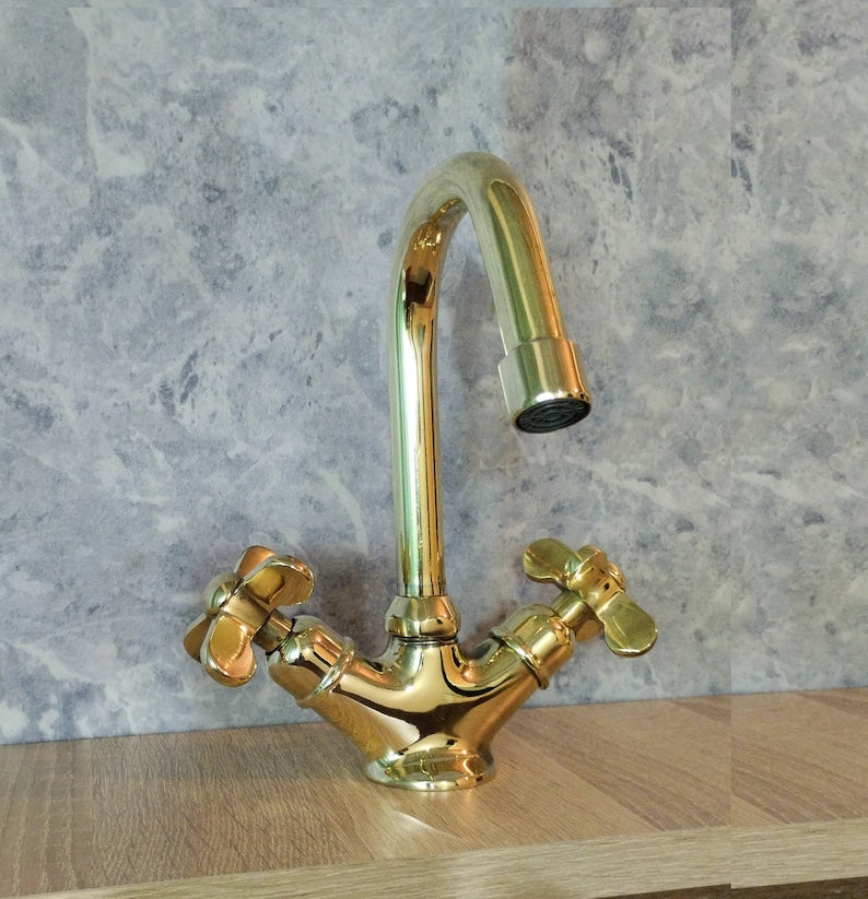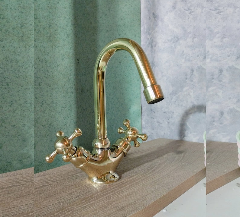 Unlacquered Brass Gooseneck Bathroom Faucet: Single Hole, Cross Handle