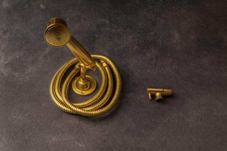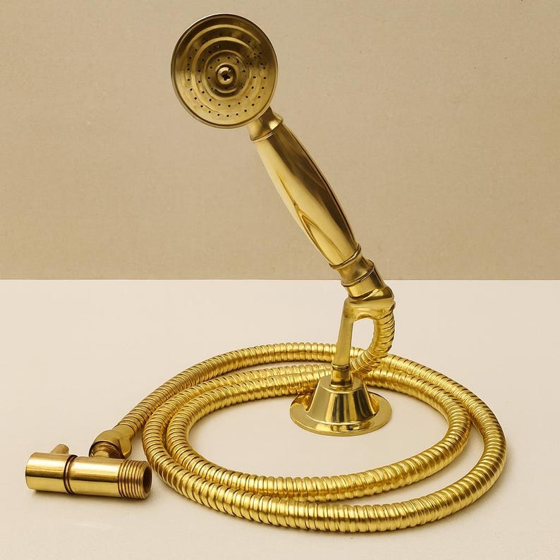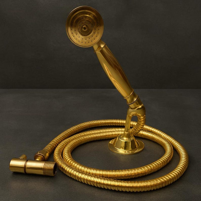 Upgrade your bathroom with this unlacquered brass handheld shower head set, crafted for luxury, durability, and timeless style. Perfect for vintage, classic, rustic, or modern bathrooms, this wall-mounted set includes a handheld sprayer, flexible 59-inch brass hose, wall flange, and a precise water control valve โ everything you need for a refined shower experience.