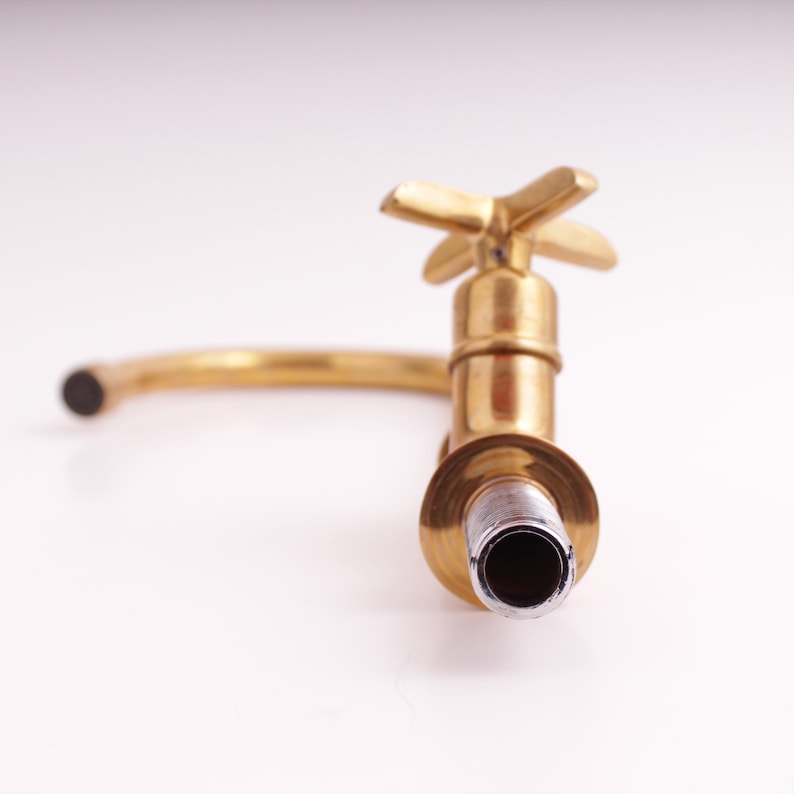 Brass faucet with high curved spout and single cross-handle design. Smooth unlacquered finish shows natural brass tones. Spout rotates 360 degrees for flexible use.