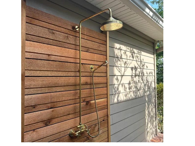 Unlacquered Brass Outdoor Shower System: Exposed Pipe Rain Shower Head & Handheld (Copy)