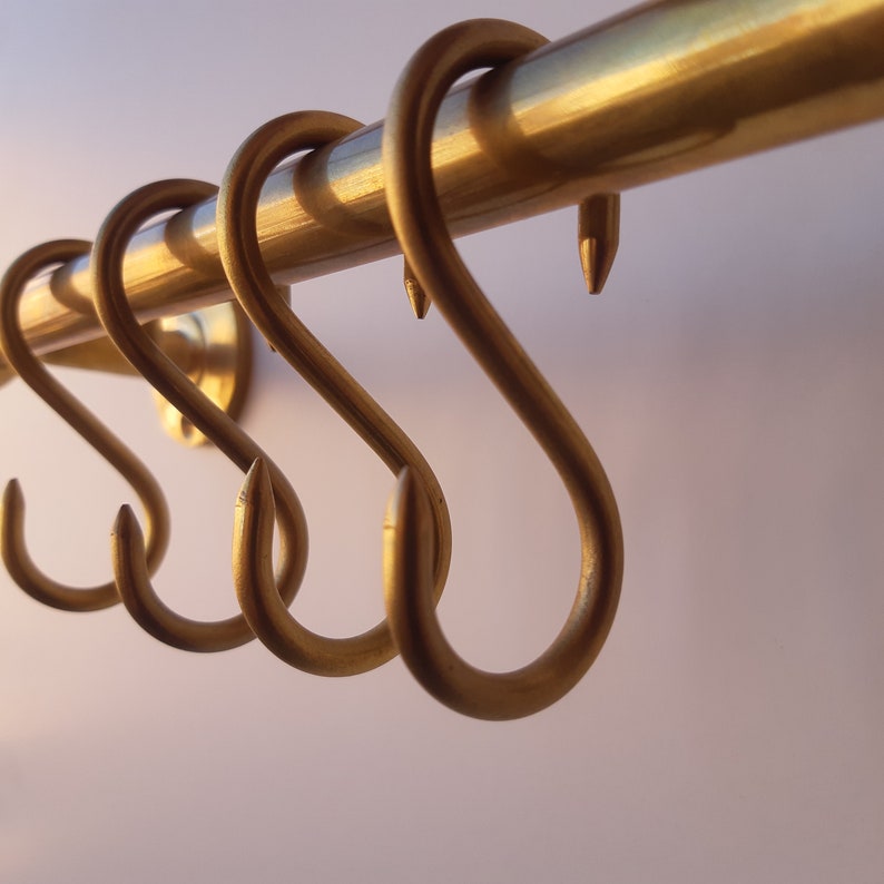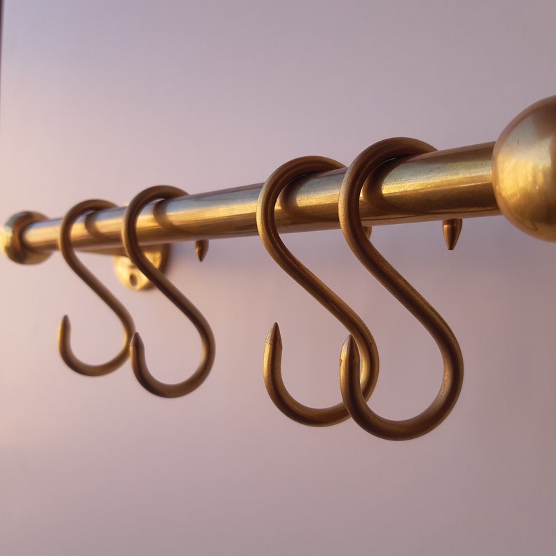 Unlacquered Brass Pot Rack, Handmade Hanging Pan Organizer, Wall Mounted Kitchen Rail with S Hooks, Custom Brass Kitchen Storage