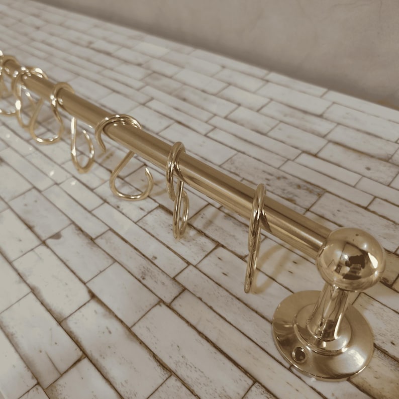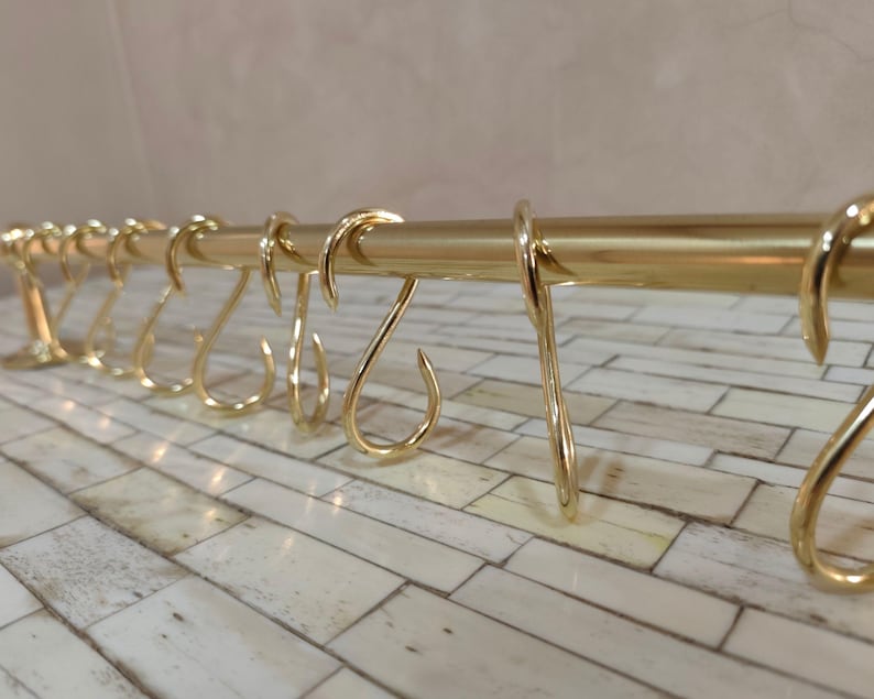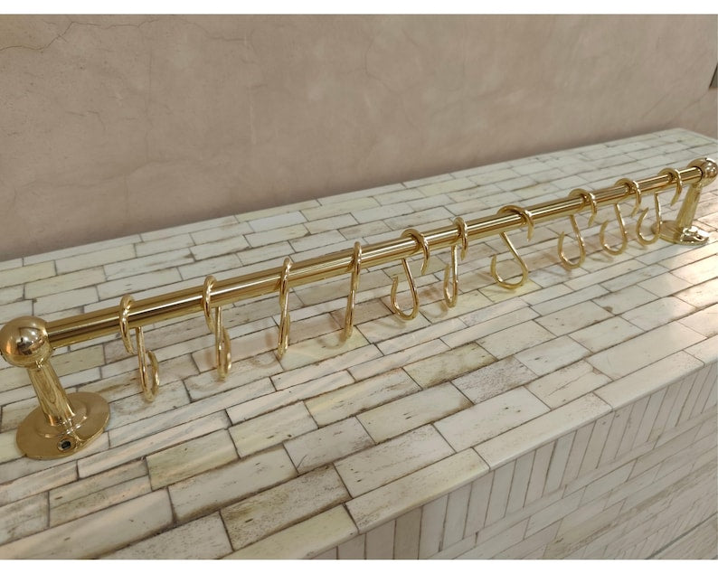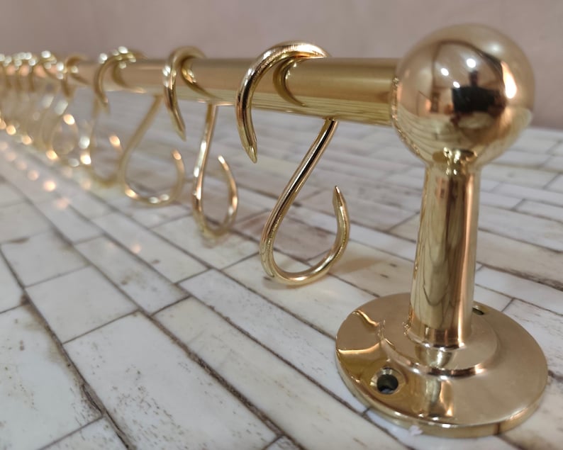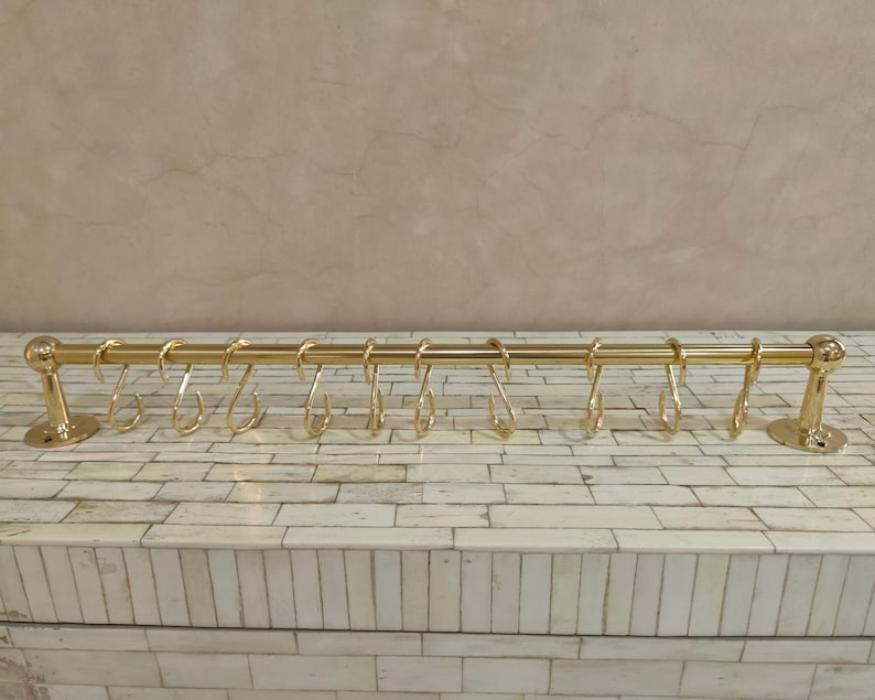Discover the beauty and functionality of our unlacquered brass pot rail featuring 5 solid brass "S" hooks. Crafted from 100% solid brass, this durable pot rail is designed to last a lifetime, bringing elegance and practicality to your kitchen.