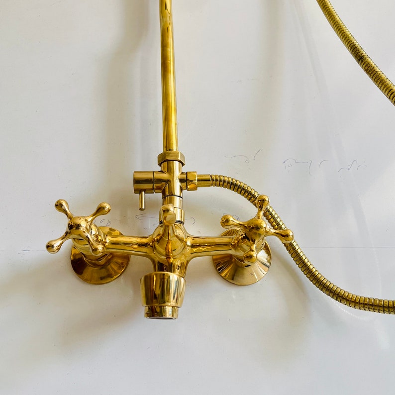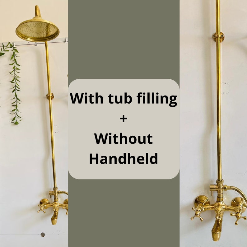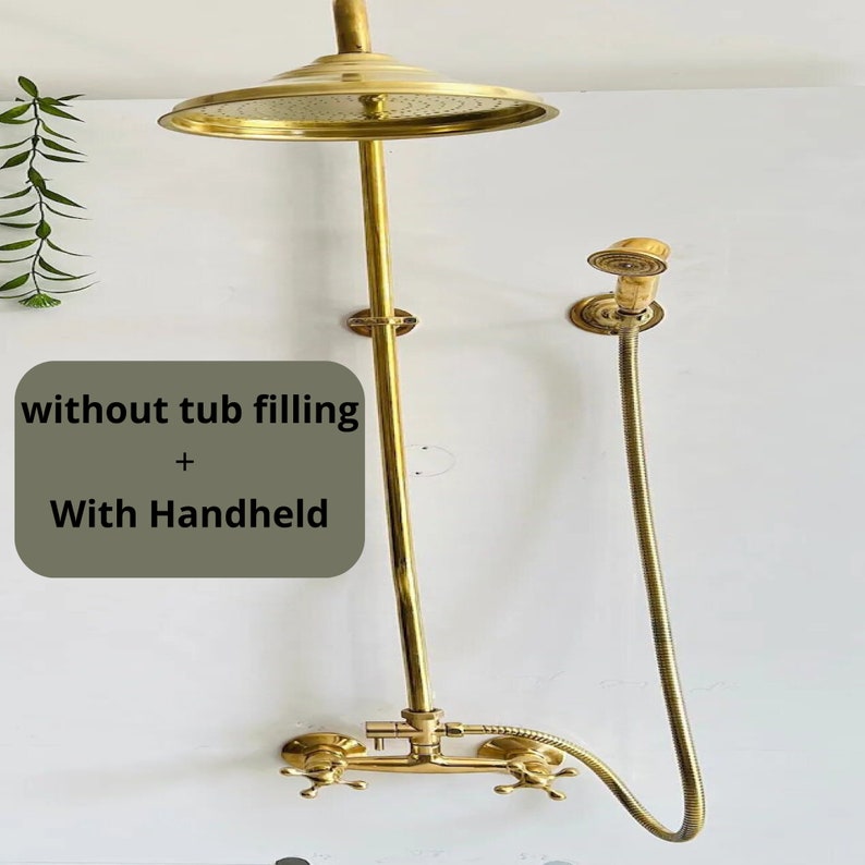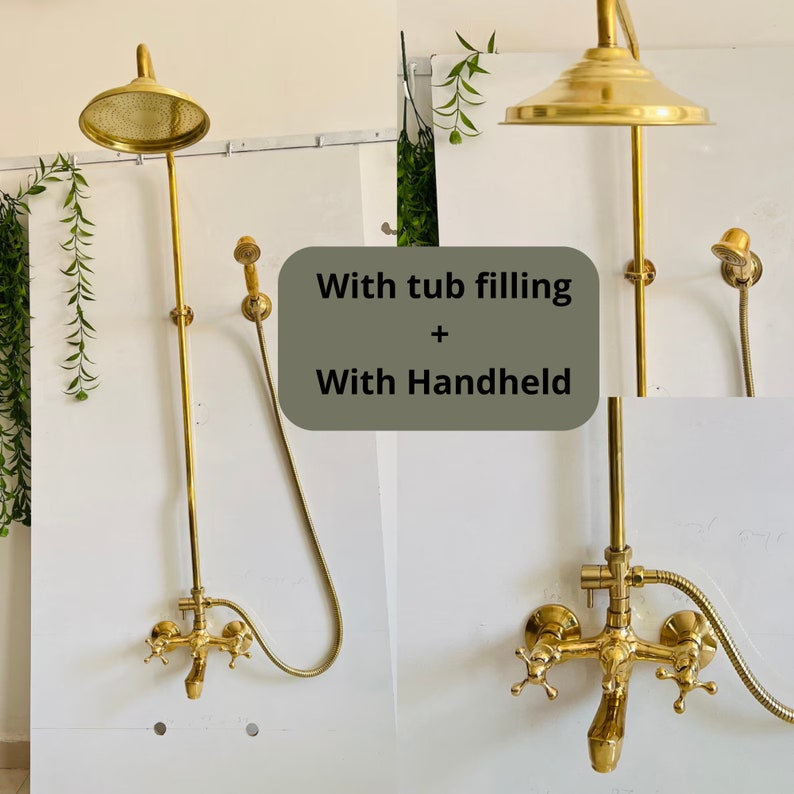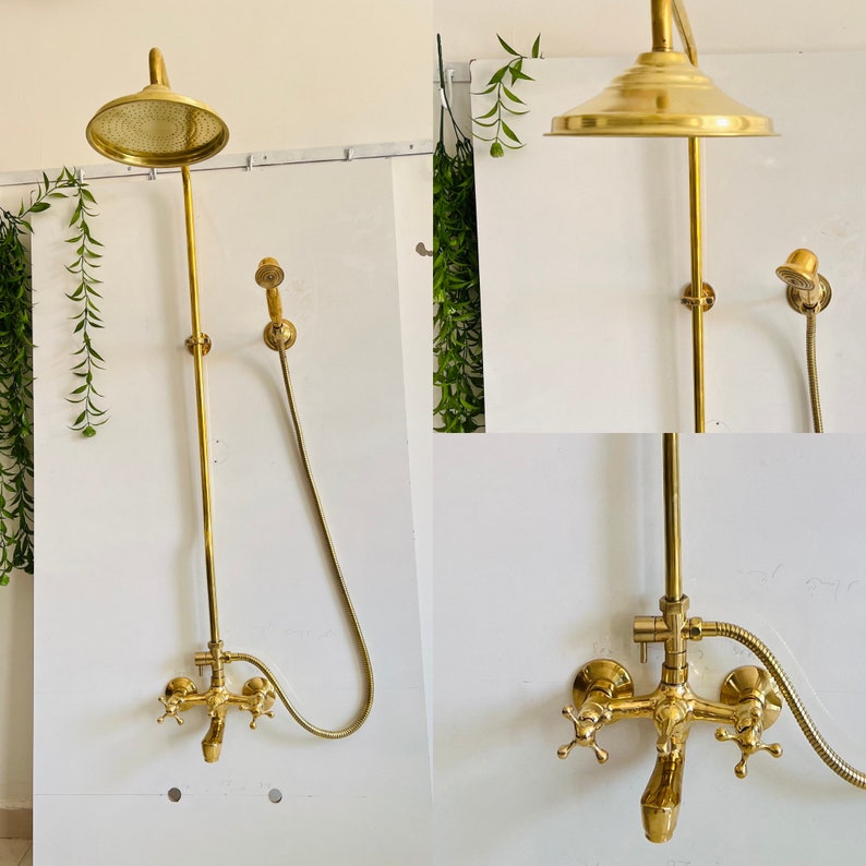 Unlacquered Brass Shower System – Solid Brass Outdoor - Indoor Shower with Rain Head, Handheld Shower and Tub Spout – Vintage Exposed Shower