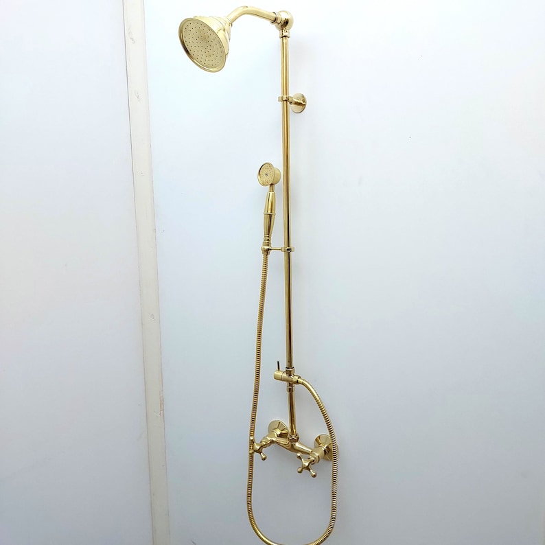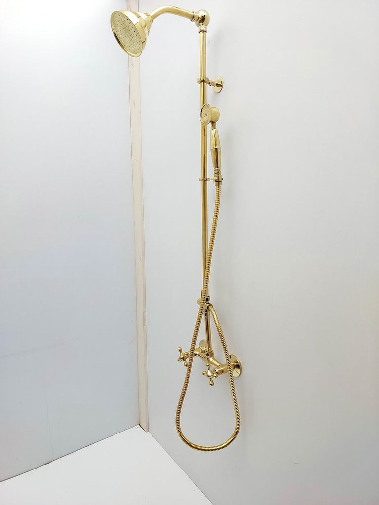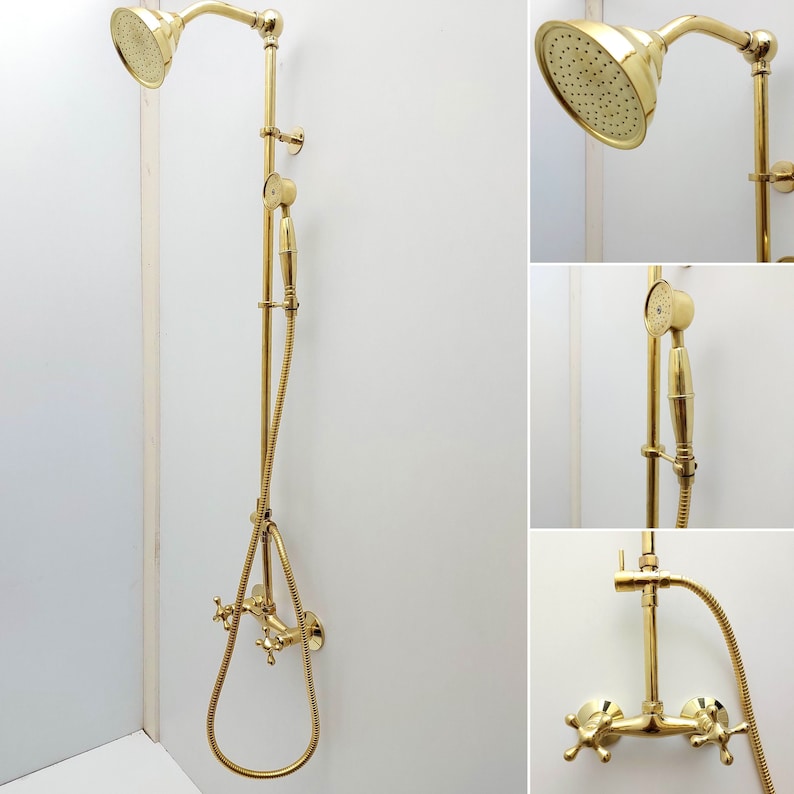 This unlacquered brass shower system is a luxurious and timeless addition to any bathroom. The set includes a handheld shower head, round shower head, two cross handles for precise water control, and a high-quality brass construction that will last for years to come.