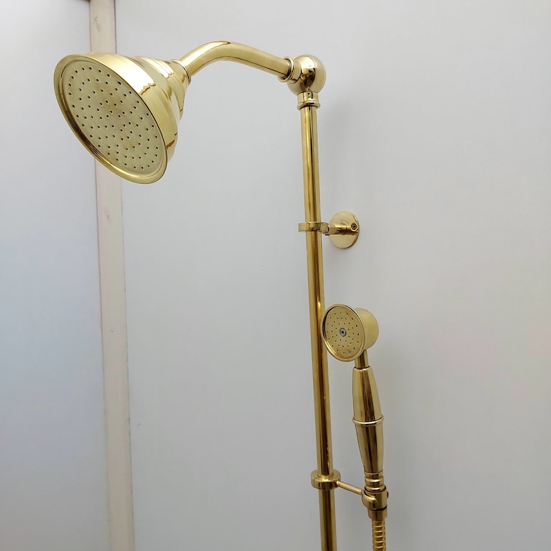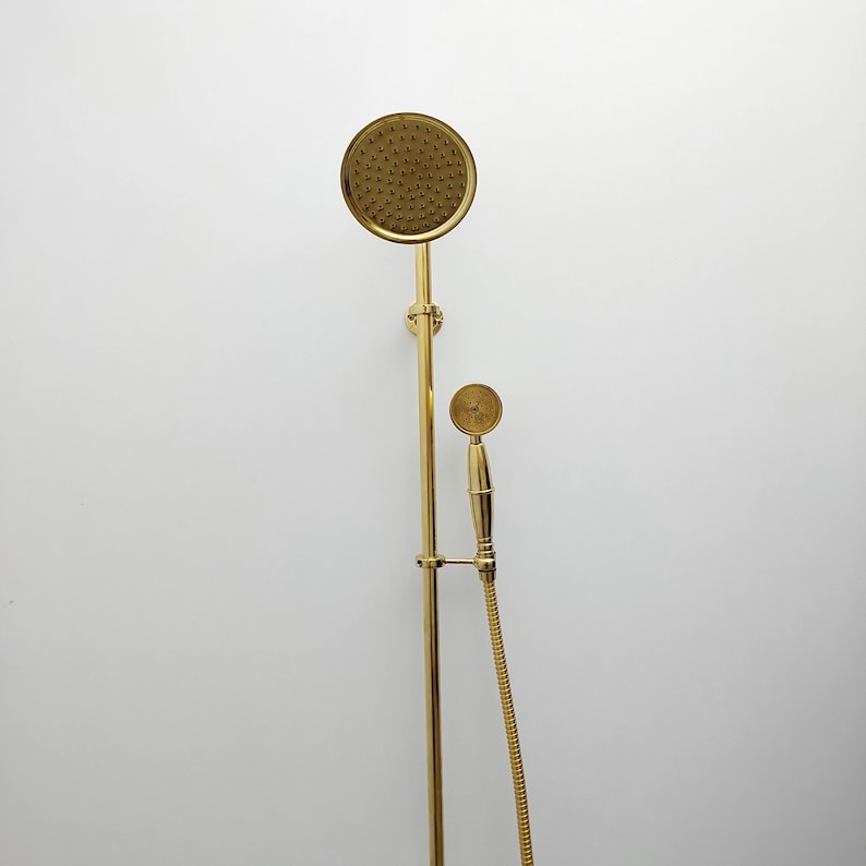 Unlacquered Brass Shower System with Handheld Shower Head and Round Shower Head