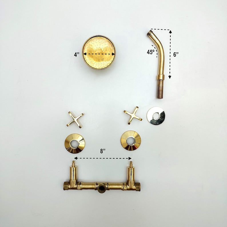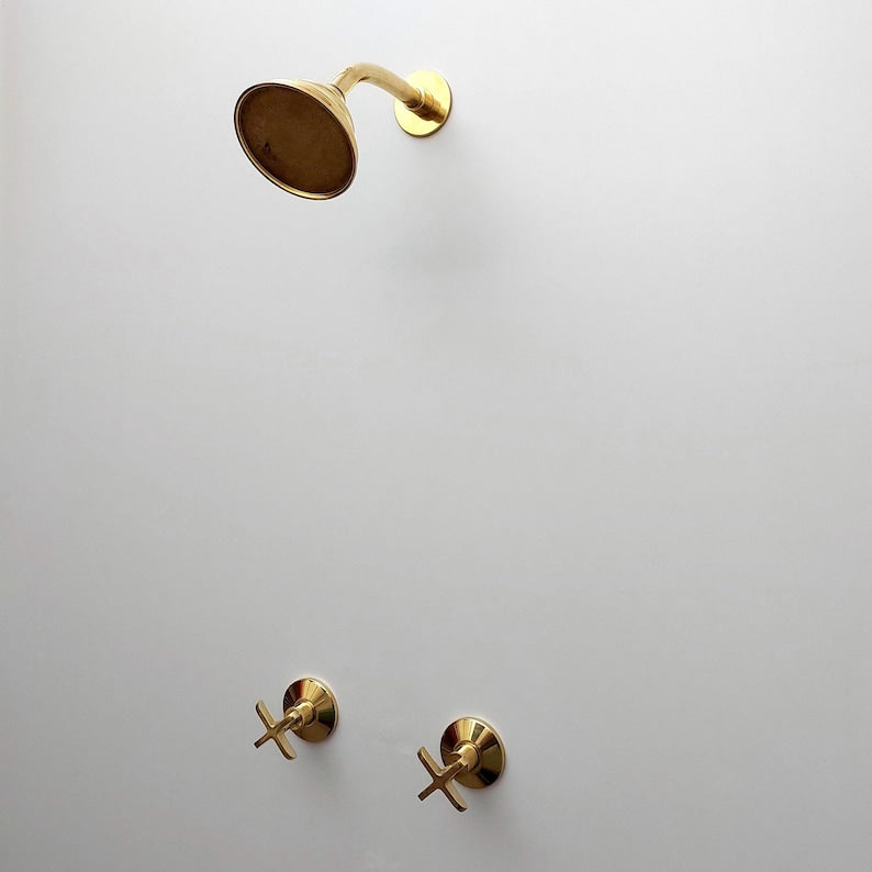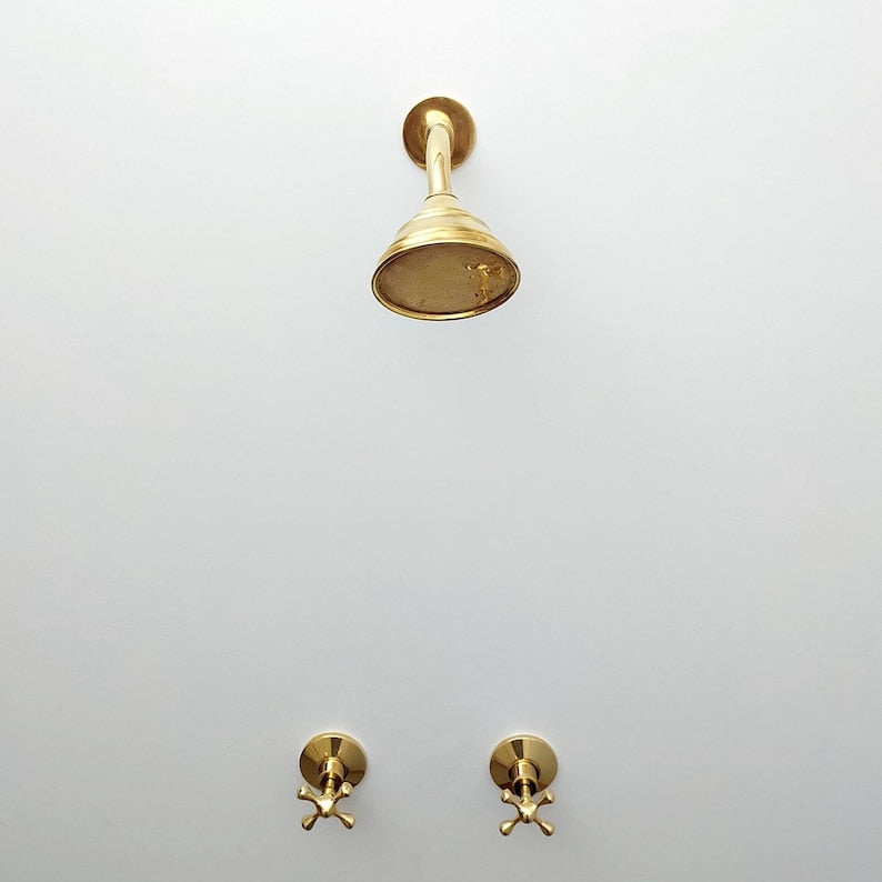 This unlacquered brass shower system is a luxurious and timeless addition to any bathroom. The set includes a round shower head, two handles for precise water control, and a high-quality brass construction that will last for years to come.