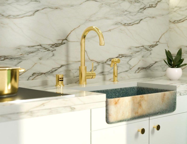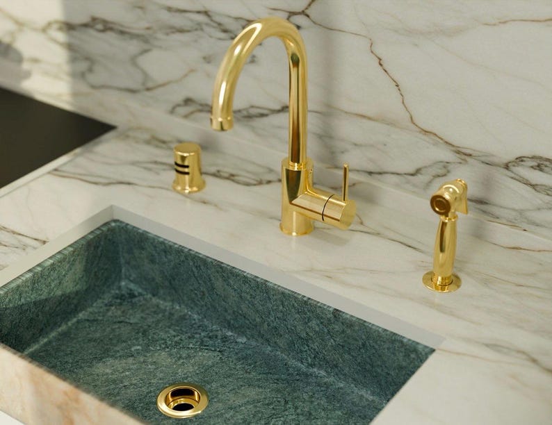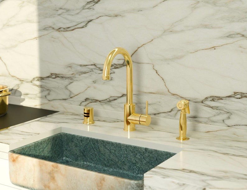 Unlacquered Brass Single Handle Deck Mount Kitchen Faucet with Side Spray — A Classic Design That Ages Beautifully