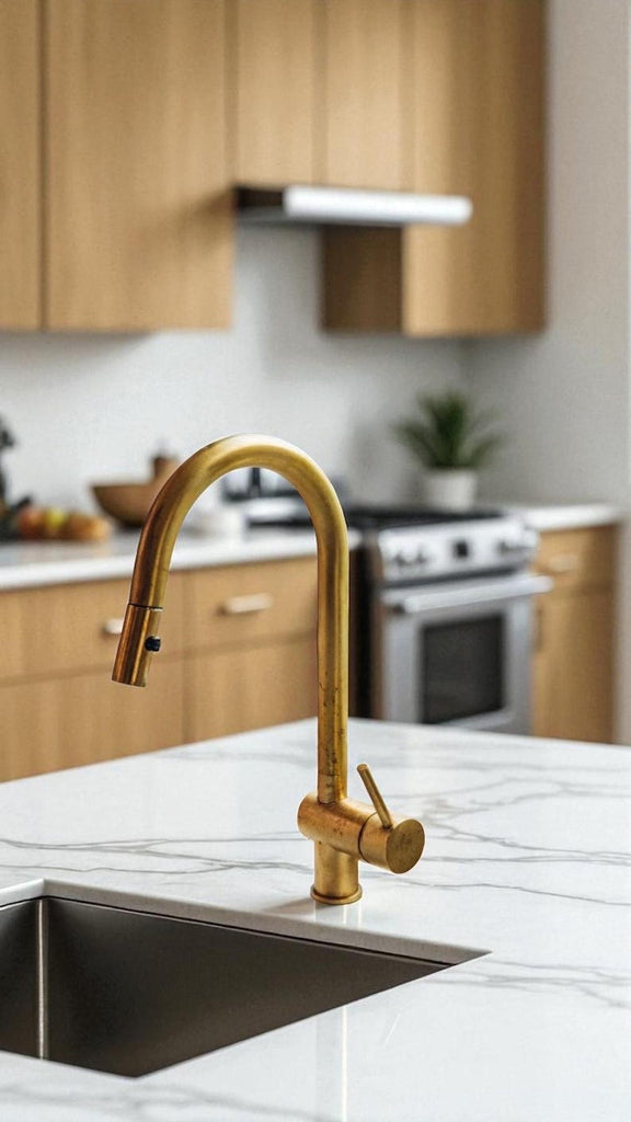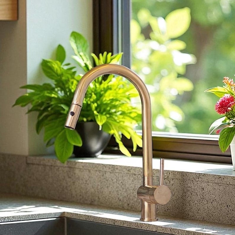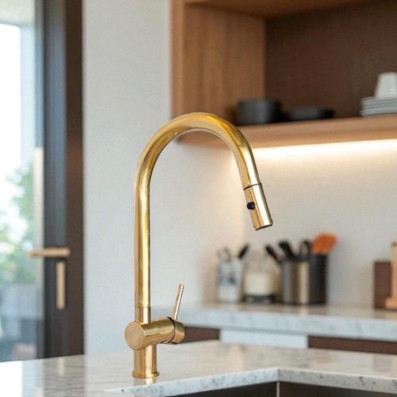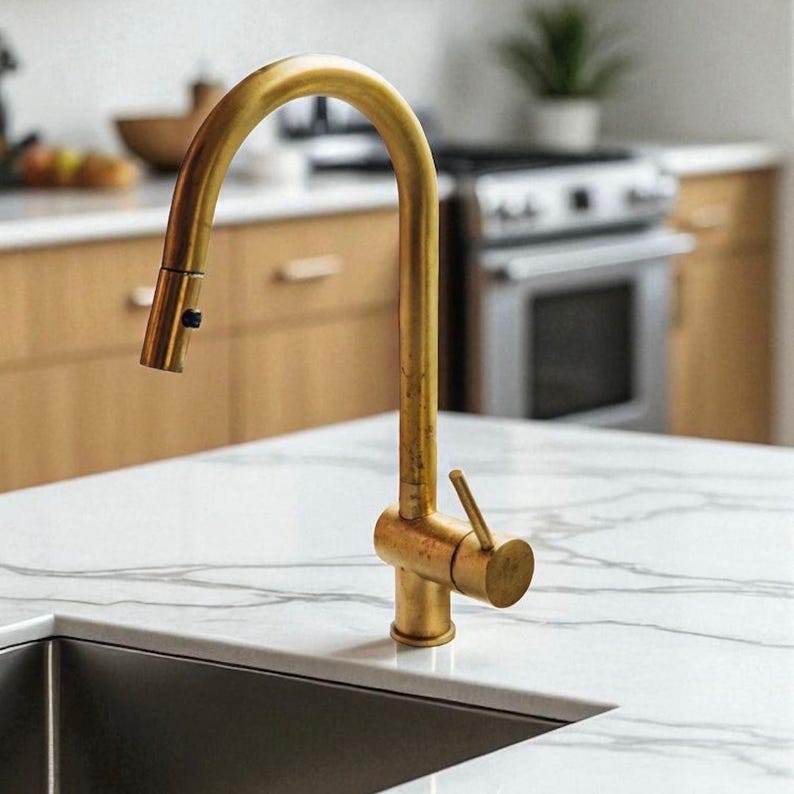 Crafted from solid unlacquered brass, this timeless kitchen faucet combines functionality with natural beauty. Designed with a high-arc gooseneck spout, it offers full 360° swivel for maximum reach and convenience. The pull-down sprayer features two functions—stream and spray—allowing you to switch easily between rinsing produce and cleaning dishes.