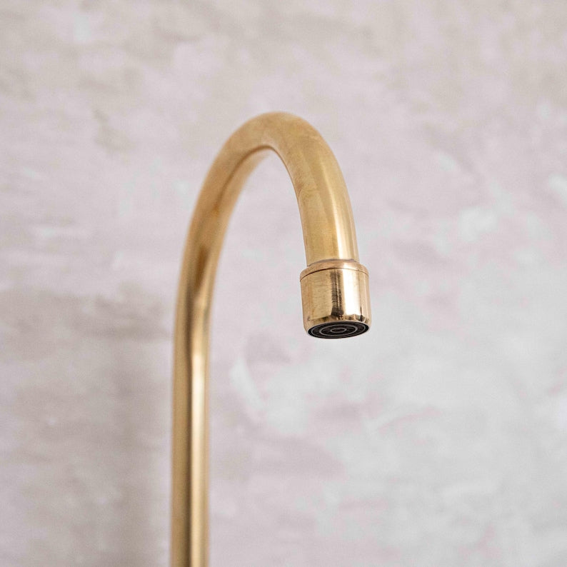 Bring lasting quality and timeless style to your kitchen with this solid brass, single-hole faucet from KESHMARK. With its tall, curved spout and classic unlacquered finish, this faucet offers both elegant aesthetics and practical performance.