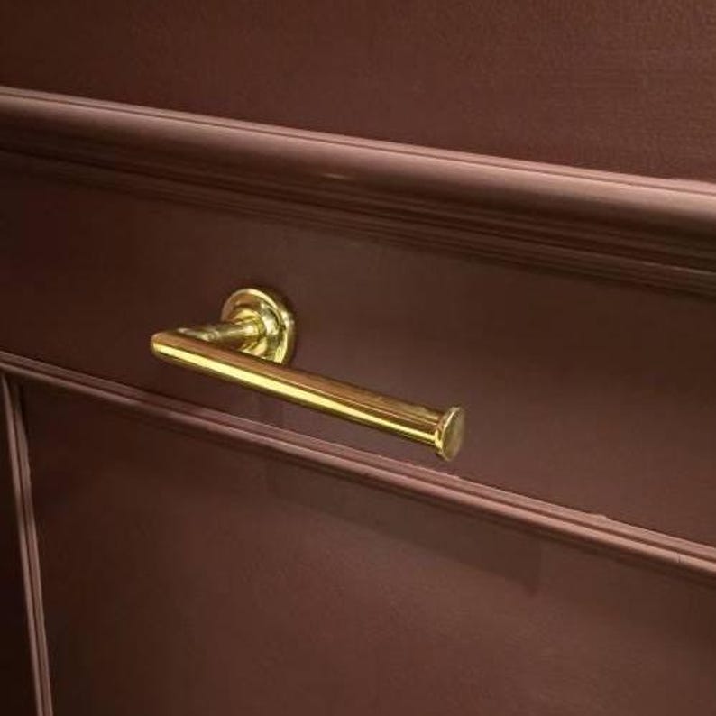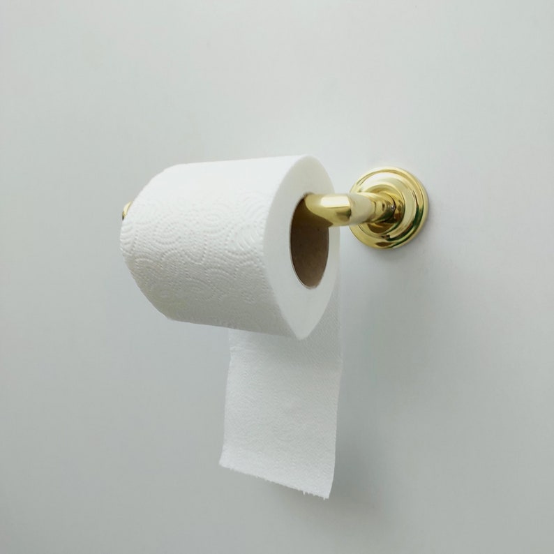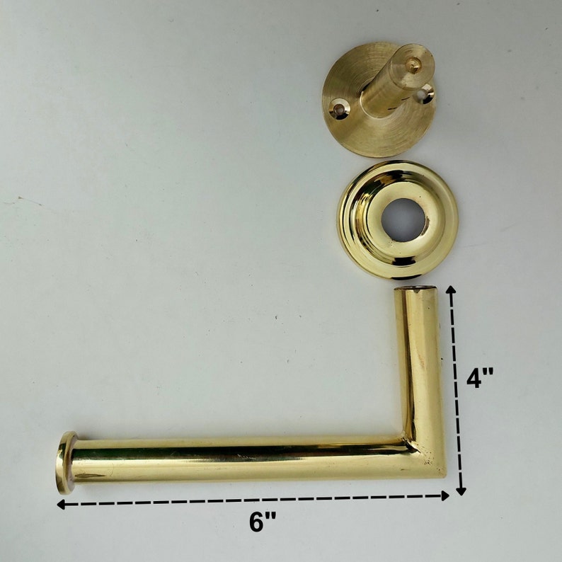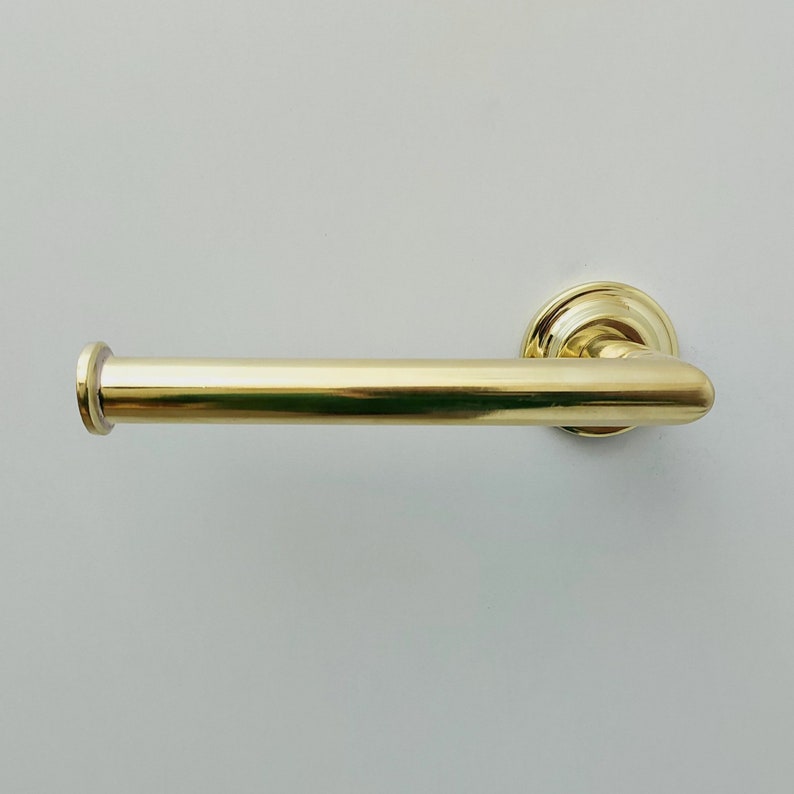 Unlacquered Brass Wall Mount Toilet Paper Holder. Crafted with care and precision, this toilet paper holder combines classic design with modern functionality. The unlacquered brass finish allows the holder to develop a unique patina over time. Its sturdy construction ensures durability, while the wall-mounted design saves space and provides a clean, streamlined look.