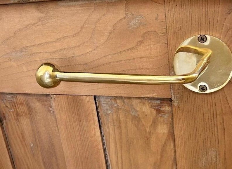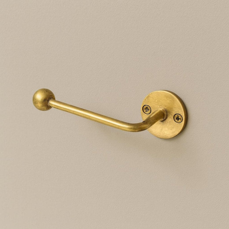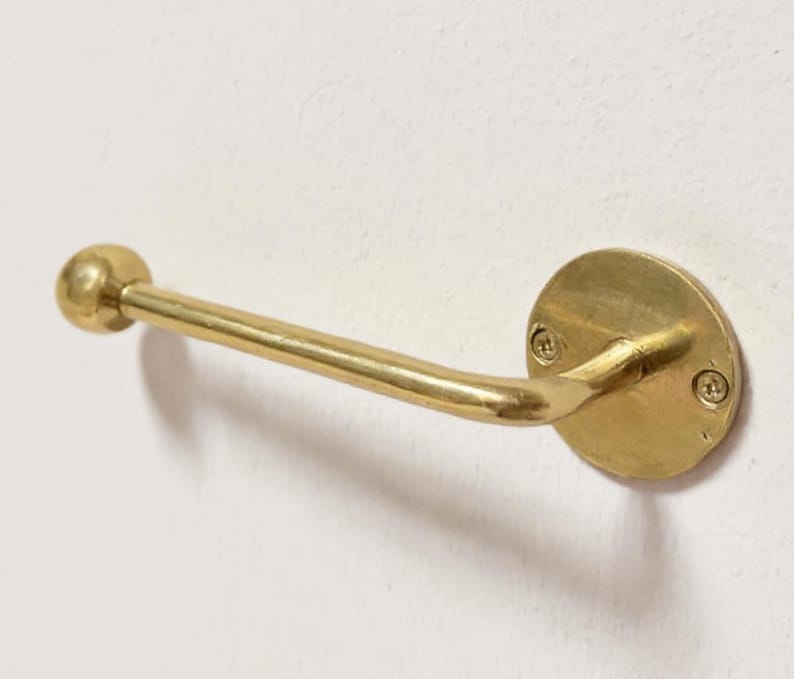 Elevate your bathroom with this handcrafted unlacquered brass toilet roll holder. Made from solid brass, this wall-mounted holder develops a natural patina over time, giving it a unique vintage look. Its timeless design combines durability and elegance, making it both functional and decorative. Easy to install, it adds rustic sophistication to any bathroom.