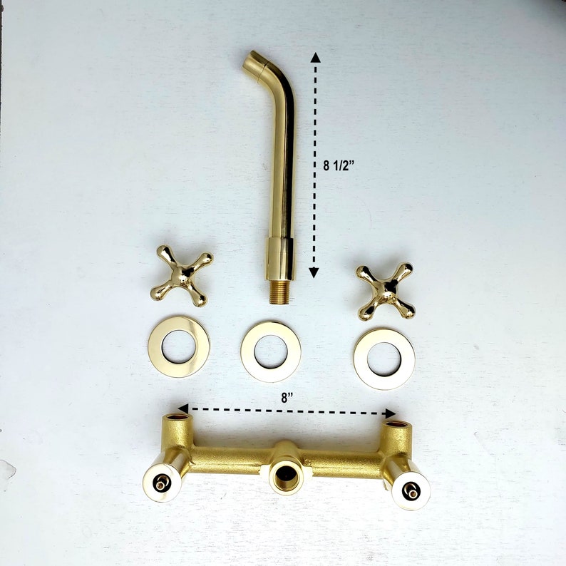 Unlacquered Brass Wall Mount Bathroom Faucet, Gooseneck Spout, Cross Handles
