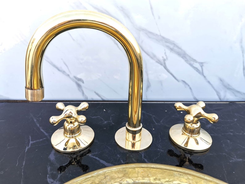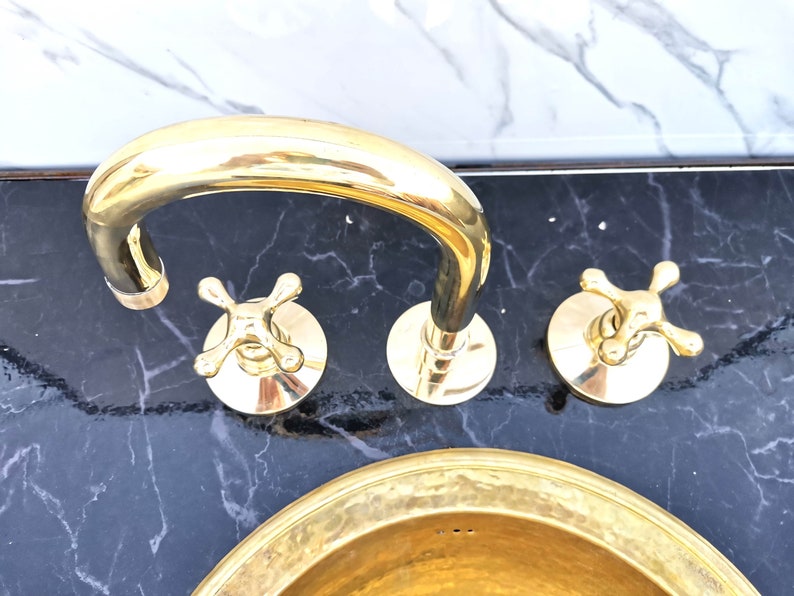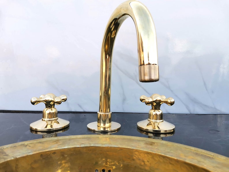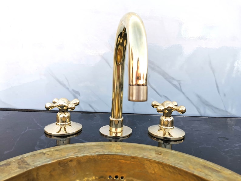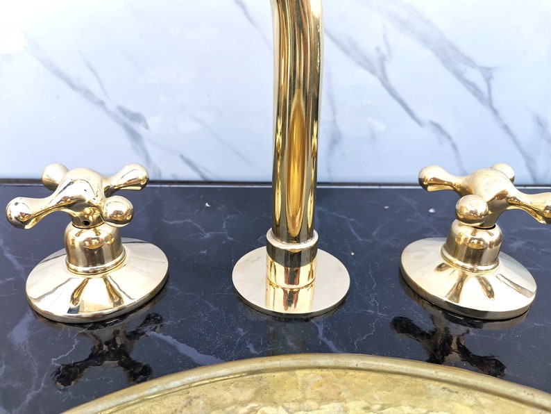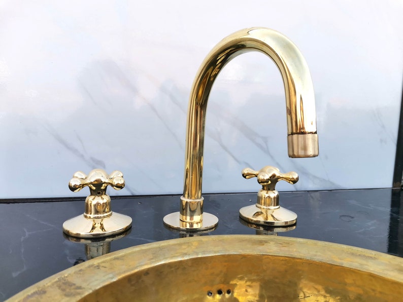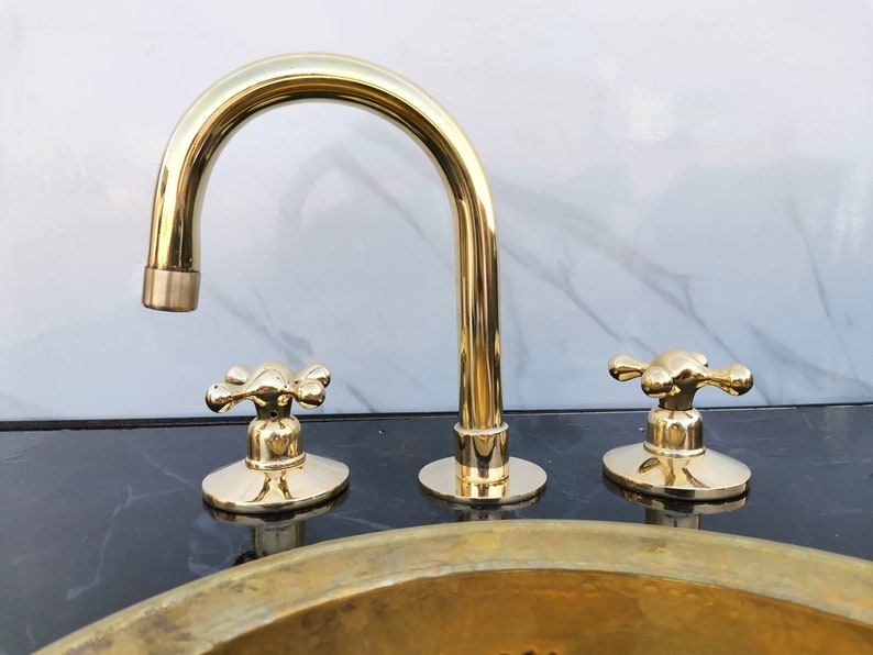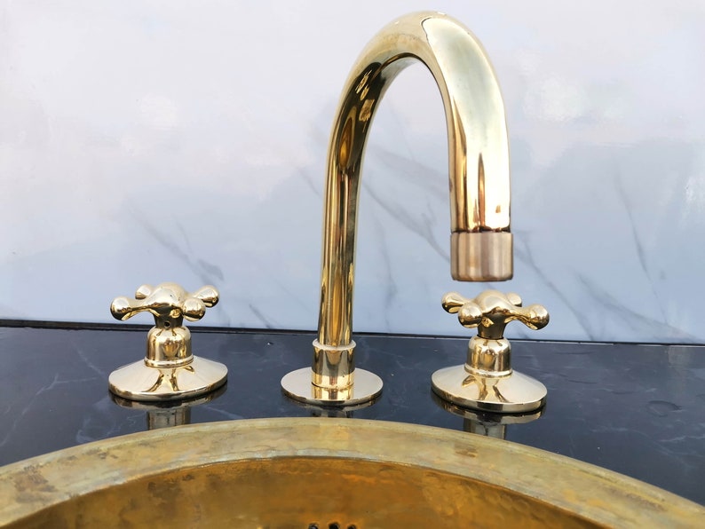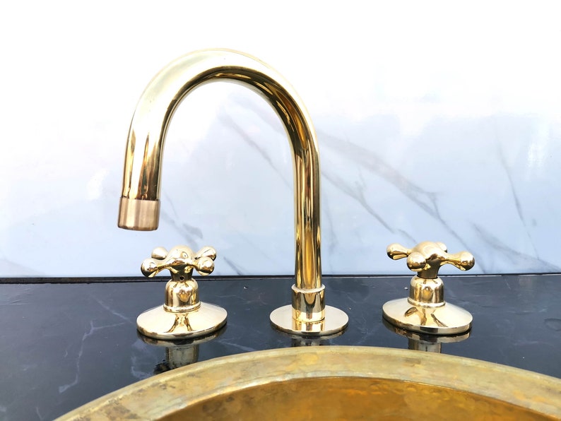 Unlacquered Brass Vanity Faucet | Three Holes Brass Faucet | Widespread Bathroom Faucet Sink | Vintage Brass Faucet With Simple Cross Handles