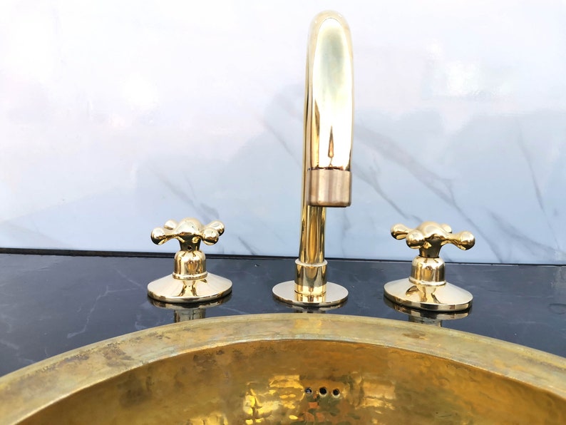 Handmade Unlacquered Brass Bathroom Faucet: 3-Hole Widespread Sink