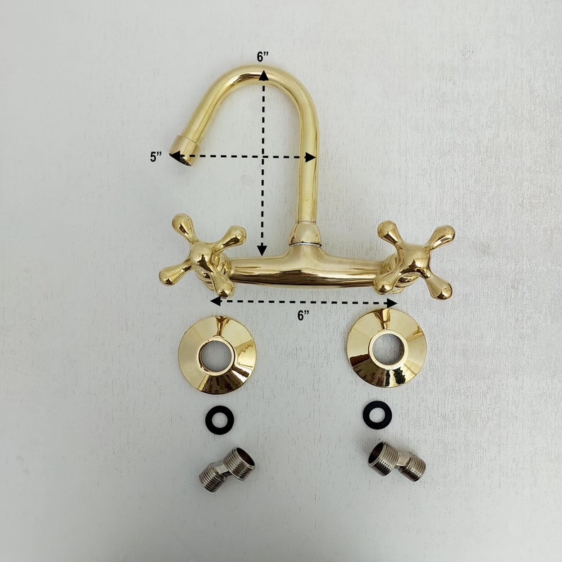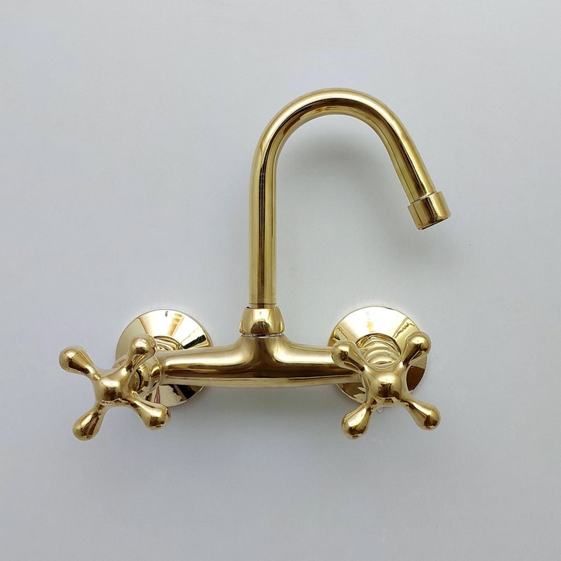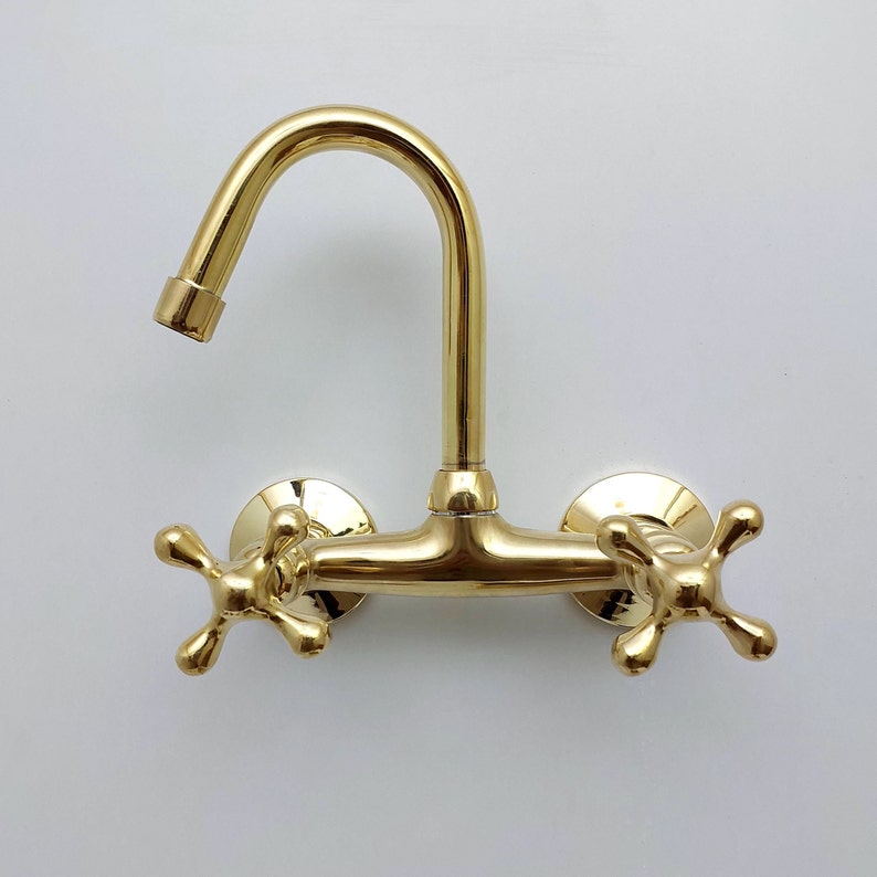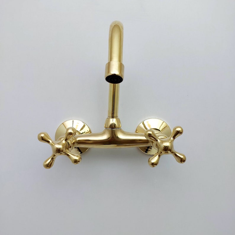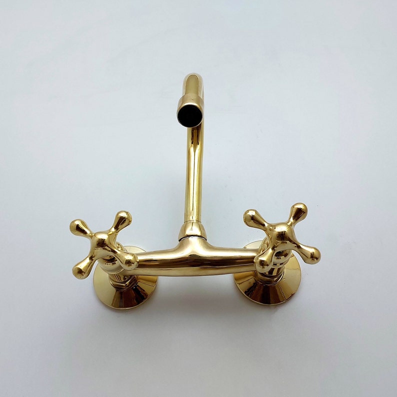 Unlacquered Brass Wall Mount Faucet, Gooseneck Faucet, Vintage Brass Wall Mounted tap, 2 Hole Wall Mount Bathroom Faucet with Cross Handles