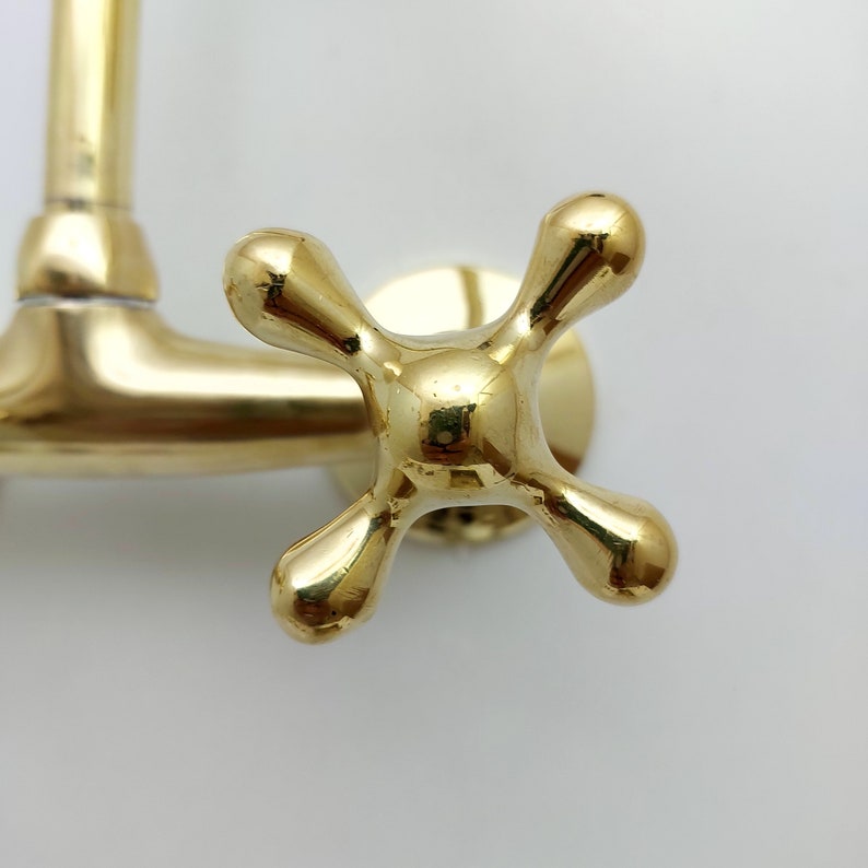 Upgrade your kitchen or bathroom with this Unlacquered Brass Wall Mounted Faucet by Atlasty! With over 30 years of experience in the brass manufacturing industry, we bring you a high-quality, durable faucet perfect for any home. This faucet features cross handles, giving you the option to choose the handle that best suits your home decor. The unlacquered brass finish adds a touch of elegance and vintage charm to your sink. Easy to install and built to last, this faucet will be a perfect addition to your home