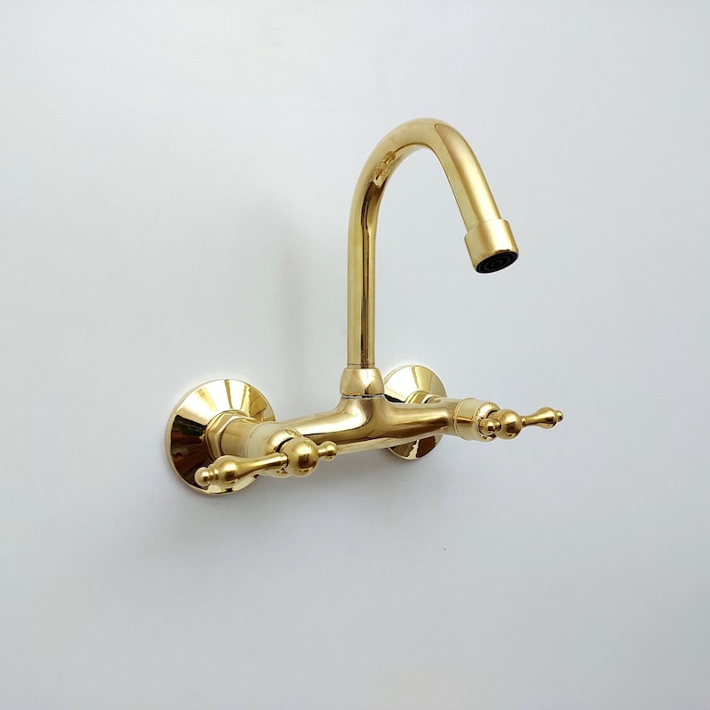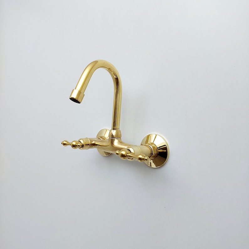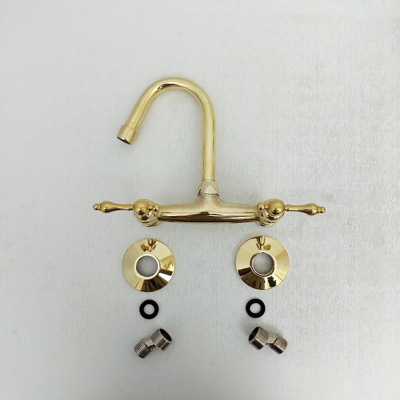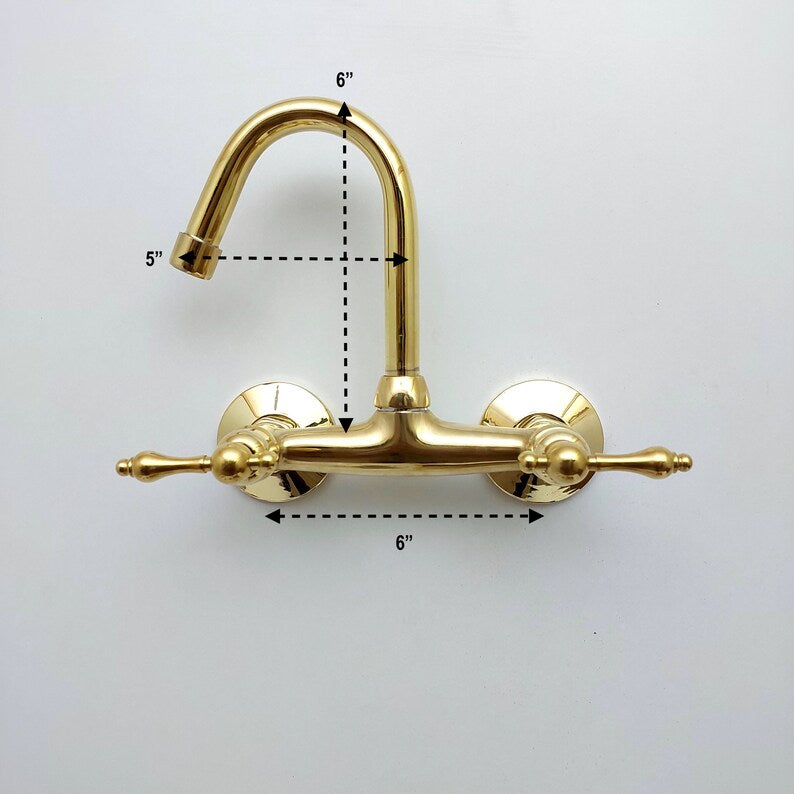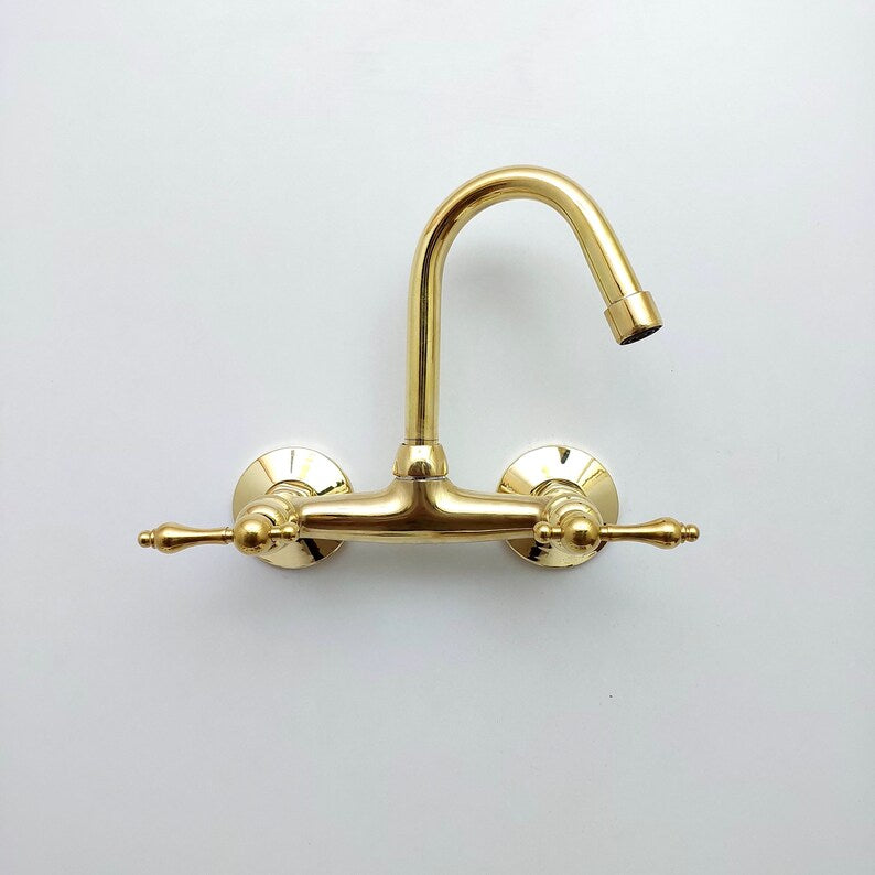 Unlacquered Brass Wall Mount Faucet, Gooseneck Faucet, Vintage Brass Wall Mounted tap, 2 Hole Wall Mount Bathroom Faucet with Lever Handles