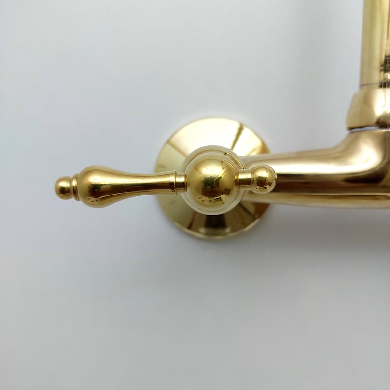 Upgrade your kitchen or bathroom with this Unlacquered Brass Wall Mounted Faucet by KESHMARK With over 30 years of experience in the brass manufacturing industry, we bring you a high-quality, durable faucet perfect for any home. This faucet features lever handles, giving you the option to choose the handle that best suits your home decor. The unlacquered brass finish adds a touch of elegance and vintage charm to your sink. Easy to install and built to last, this faucet will be a perfect addition to your home