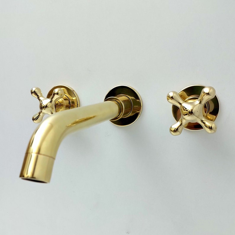 Upgrade your bathroom with this Unlacquered Brass Wall Mounted Faucet by KESHMARK With over 30 years of experience in the brass manufacturing industry, we bring you a high-quality, durable faucet perfect for any home. This faucet features cross handles, giving you the option to choose the handle that best suits your home decor. The unlacquered brass finish adds a touch of elegance and vintage charm to your sink. Easy to install and built to last, this faucet will be a perfect addition to your home