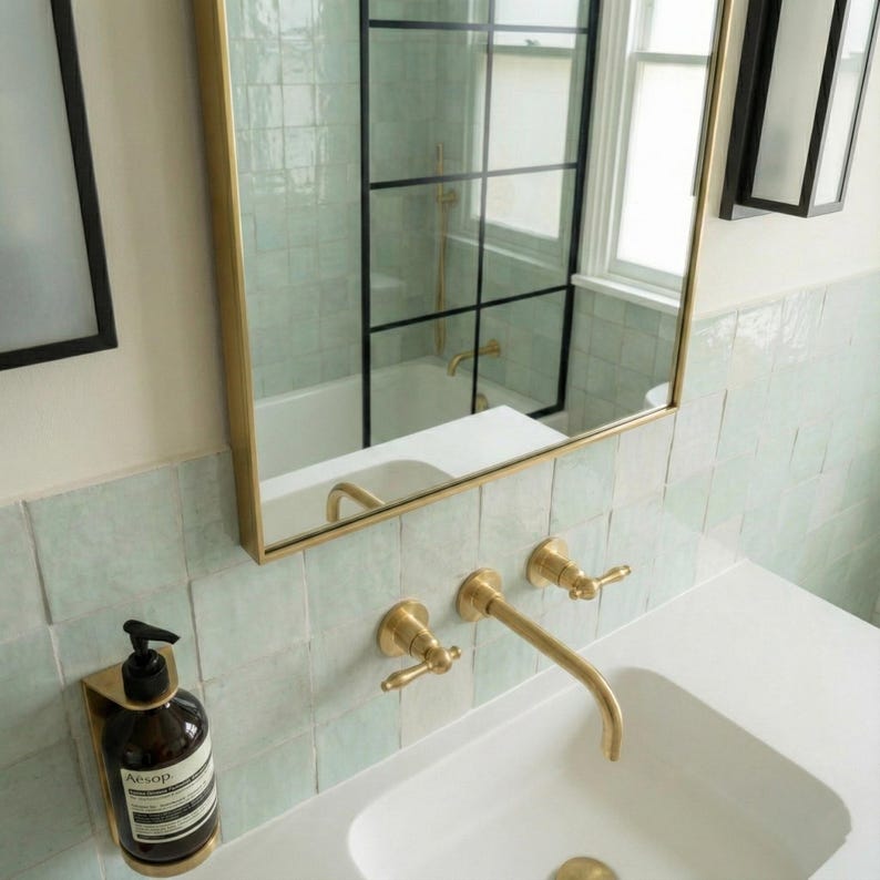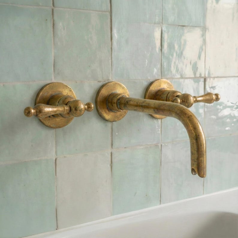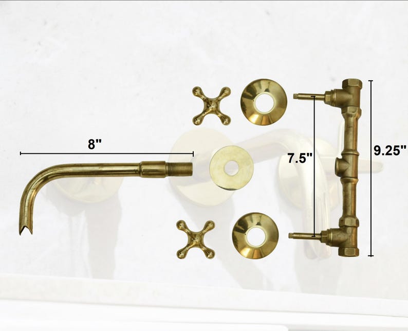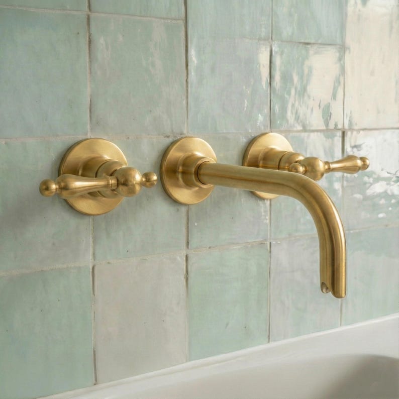 Unlacquered Brass Wall Mount Faucet Set – Handmade Moroccan Bathroom Sink Tap, Vintage Solid Brass Fixture