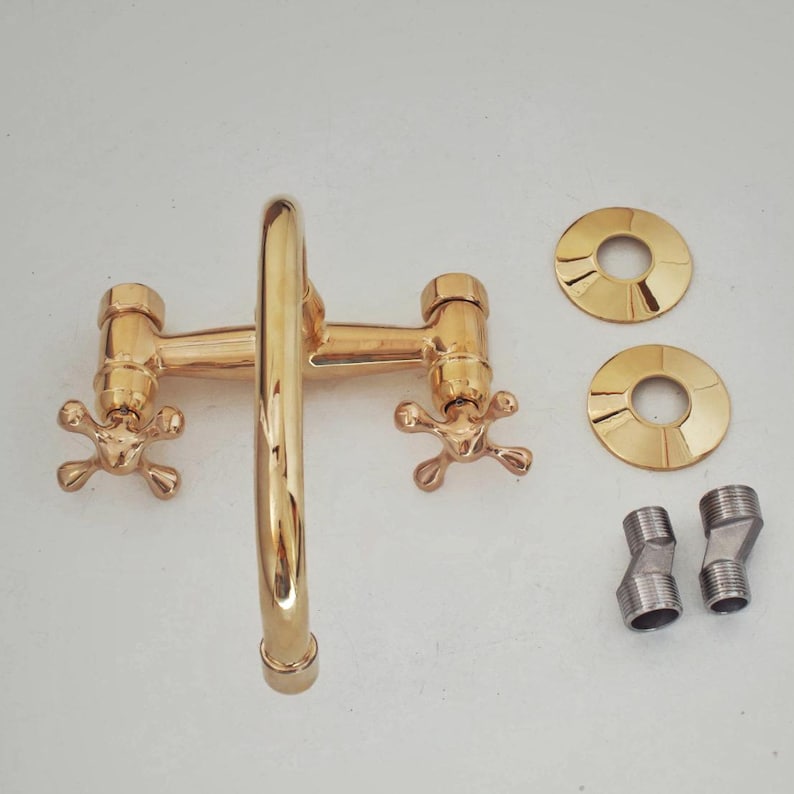 Unlacquered Brass Wall Mounted Faucet: Swivel Gooseneck, Two Handles