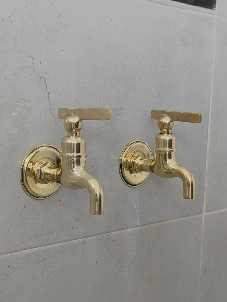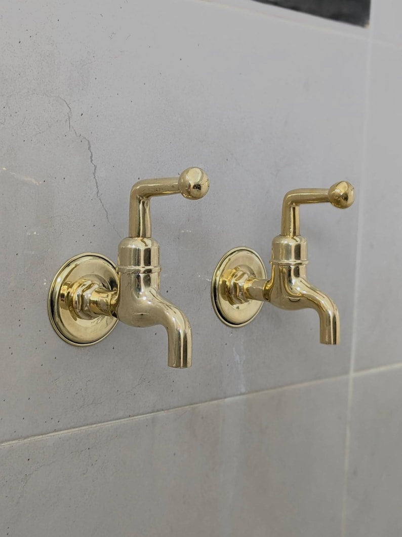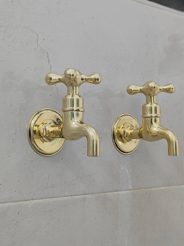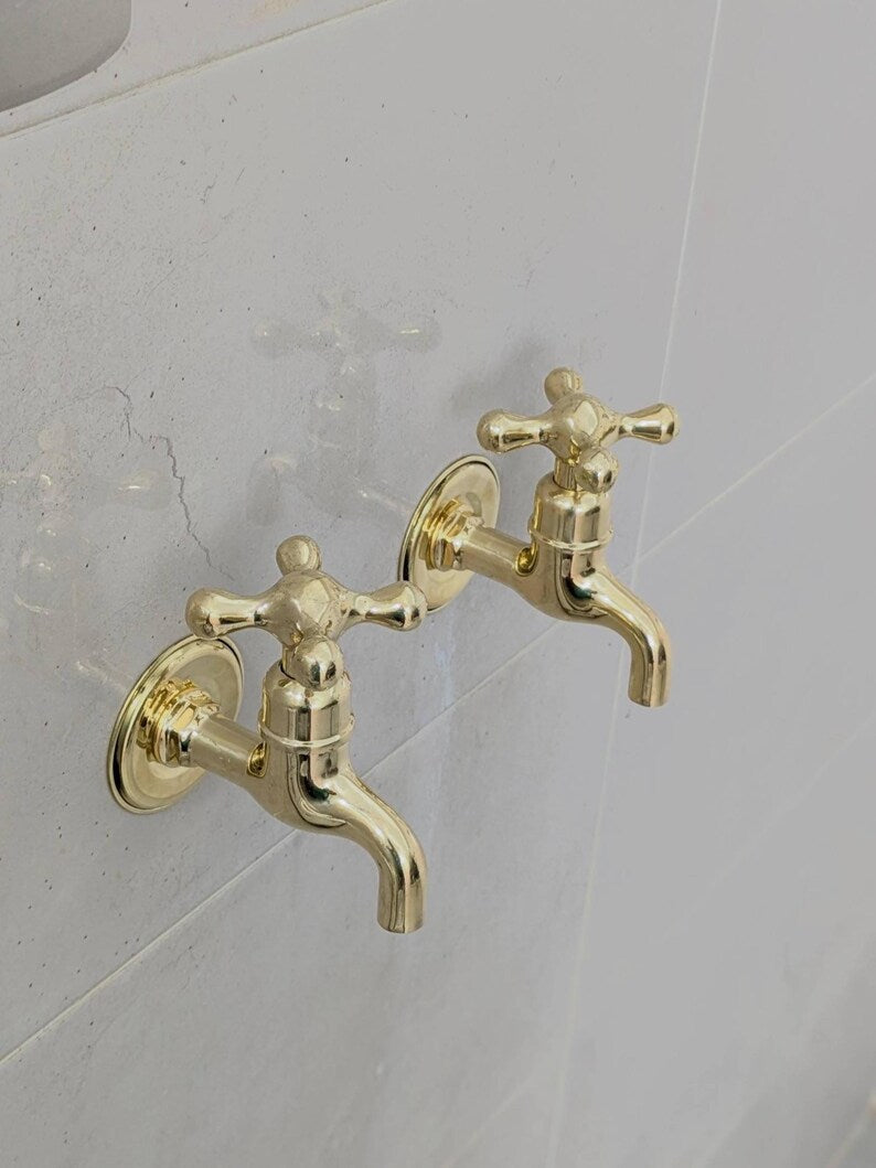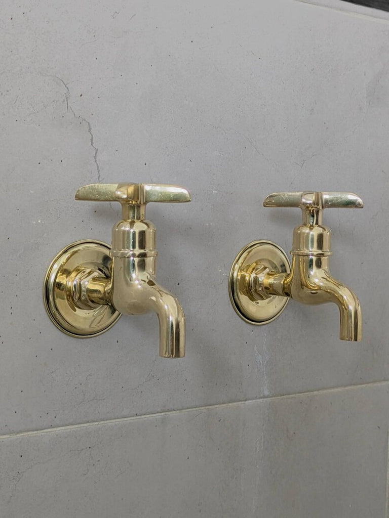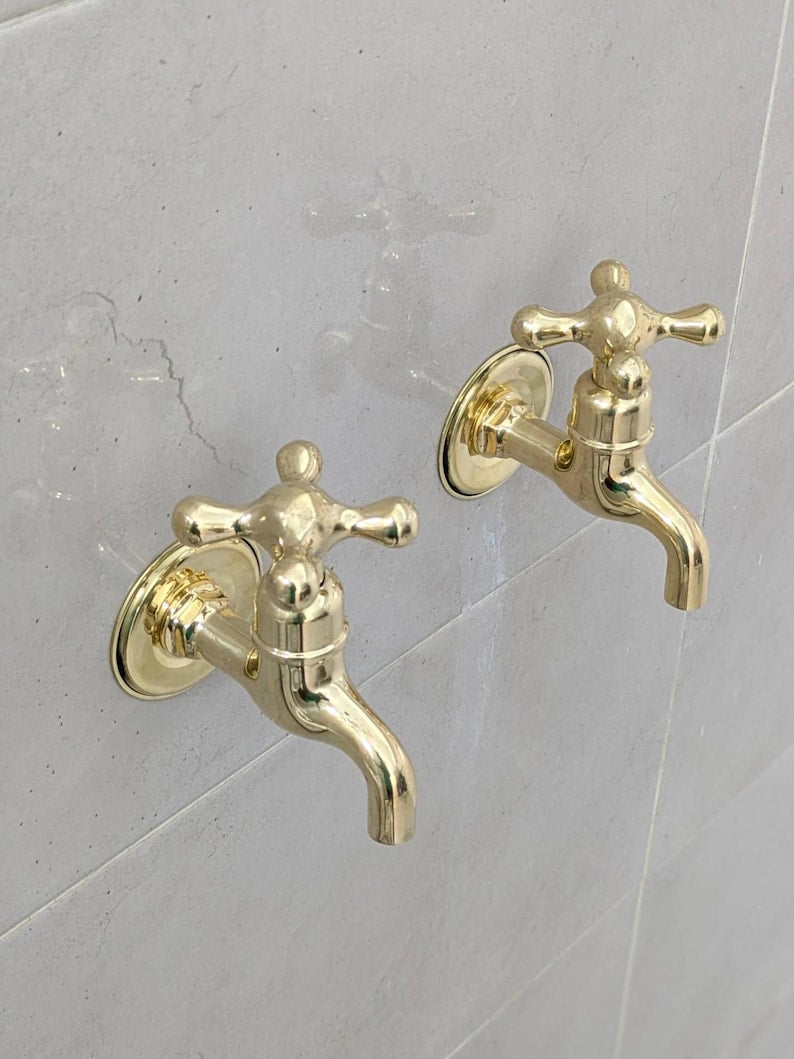 These wall-mounted brass taps are perfect for those who prefer separate hot and cold faucets. They feature a simple vintage design, suitable for indoor or outdoor use. Each tap comes ready for easy installation with all parts included. The polished brass finish will naturally develop a warm patina over time.