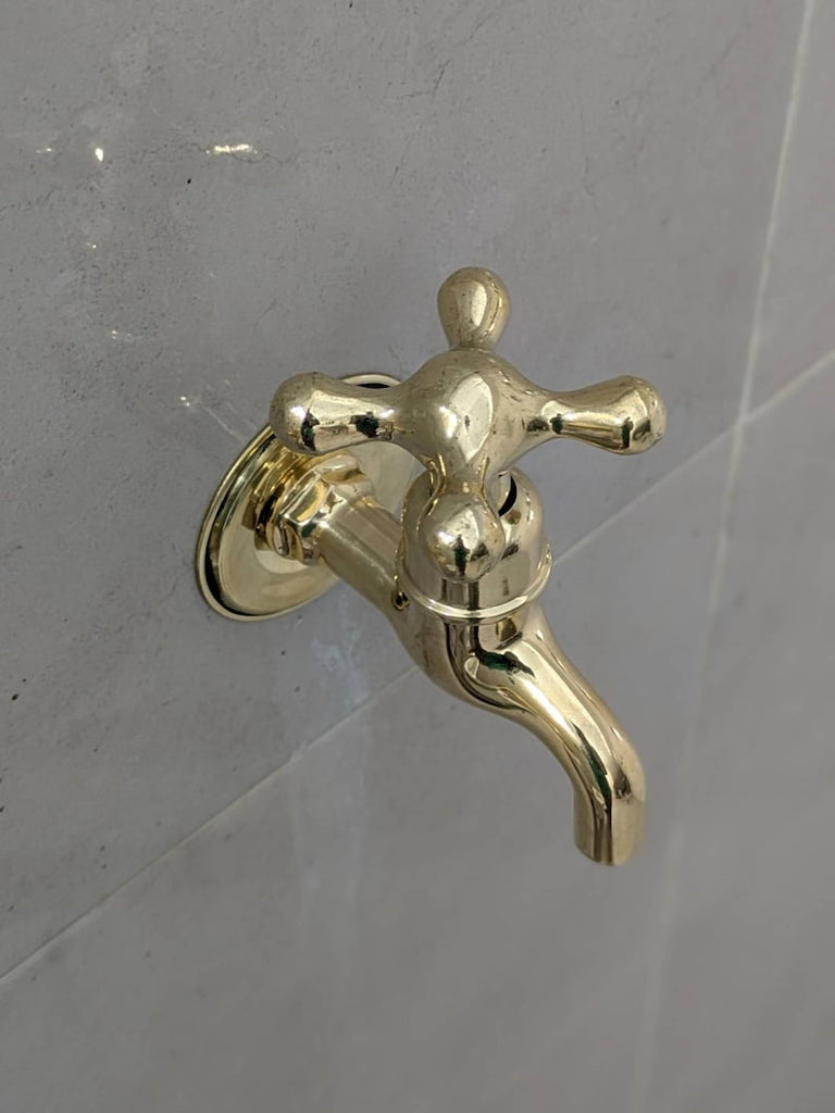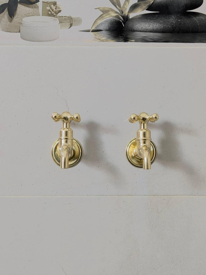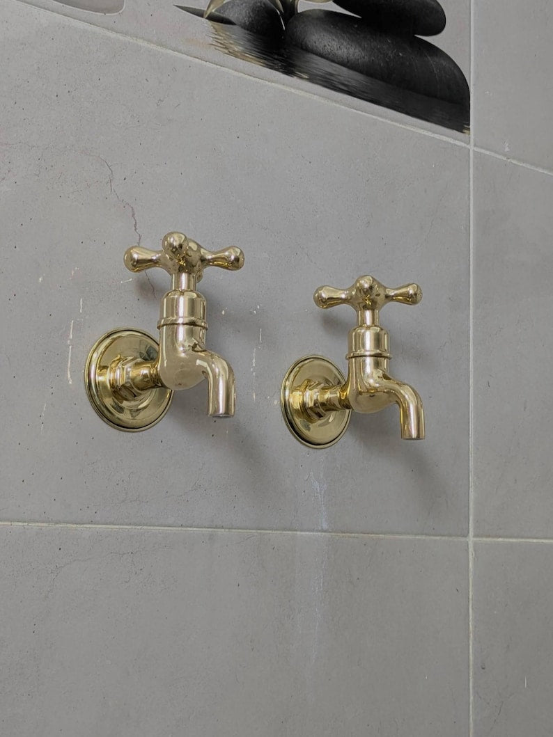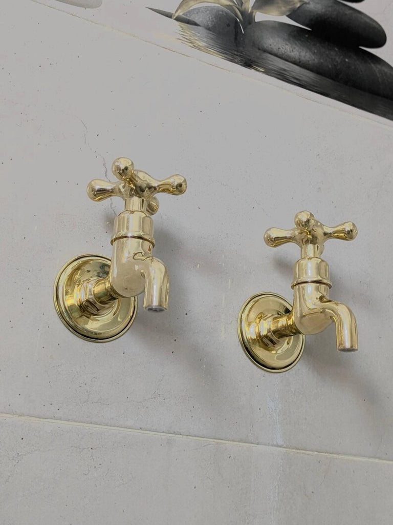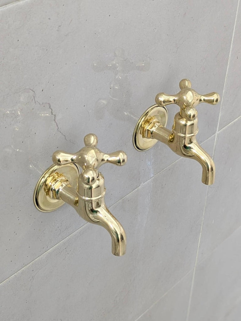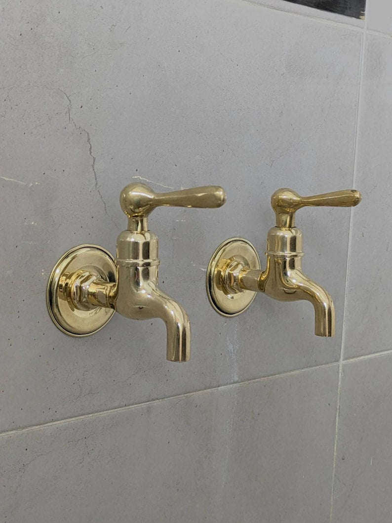 These wall-mounted brass taps are perfect for those who prefer separate hot and cold faucets. They feature a simple vintage design, suitable for indoor or outdoor use. Each tap comes ready for easy installation with all parts included. The polished brass finish will naturally develop a warm patina over time.
