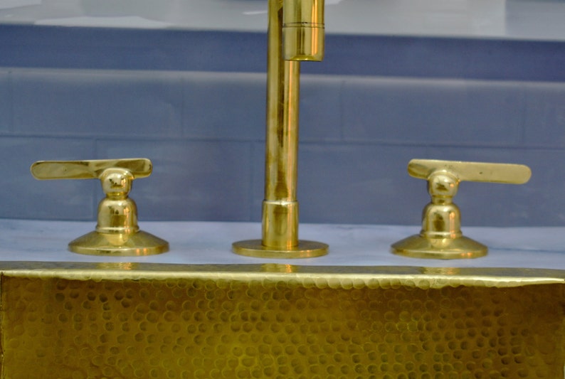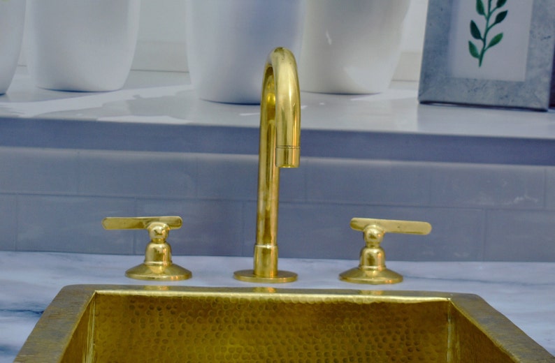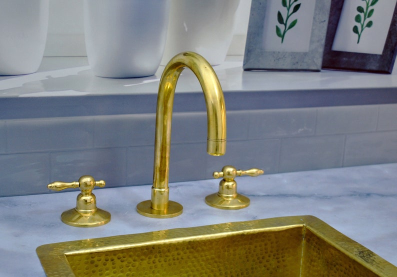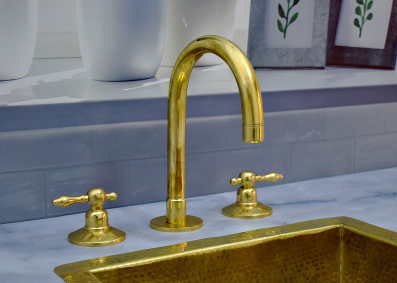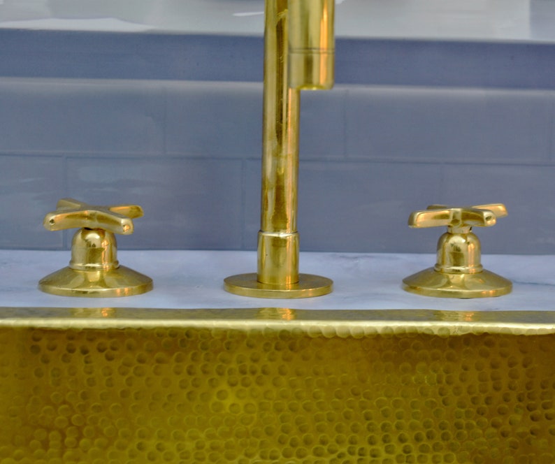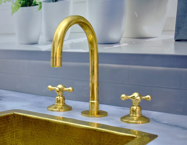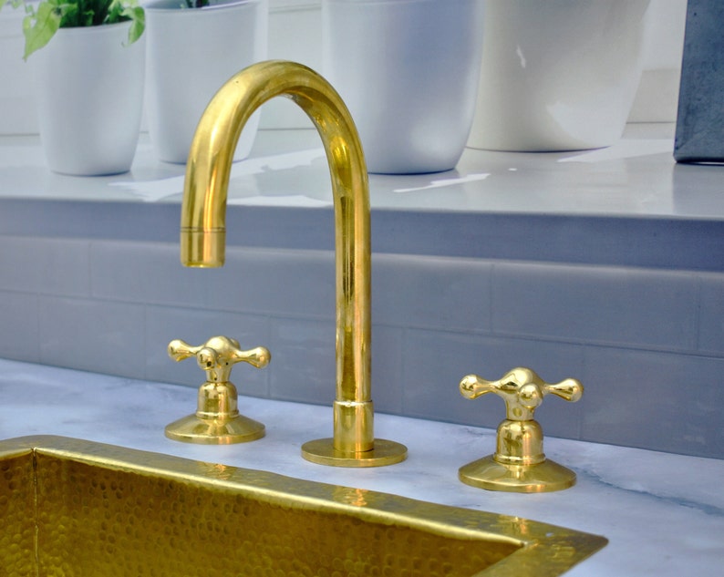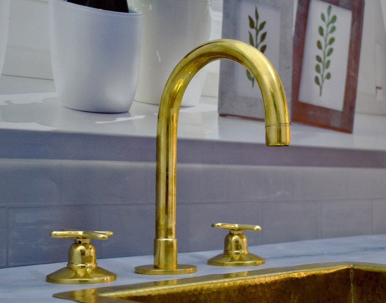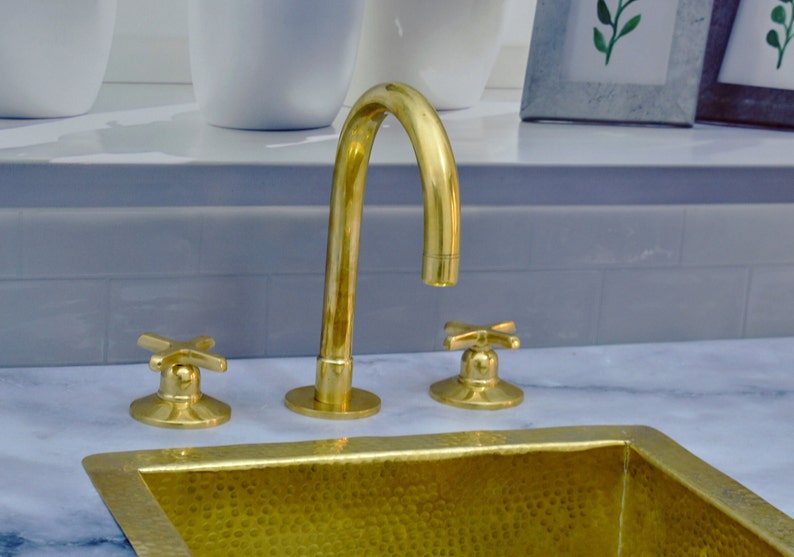 This Unlacquered Brass 3 Holes Bathroom Faucet with flat cross handles has a gooseneck shape that extends over your sink for a streamlined look and feels. The design of this solid brass product is inspired by the shape of the medina's door, Traditional cross handles to control the temperature and water flow.