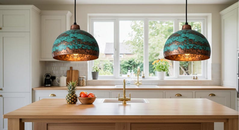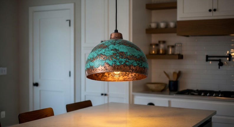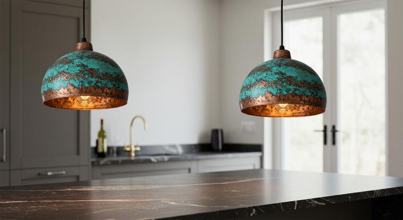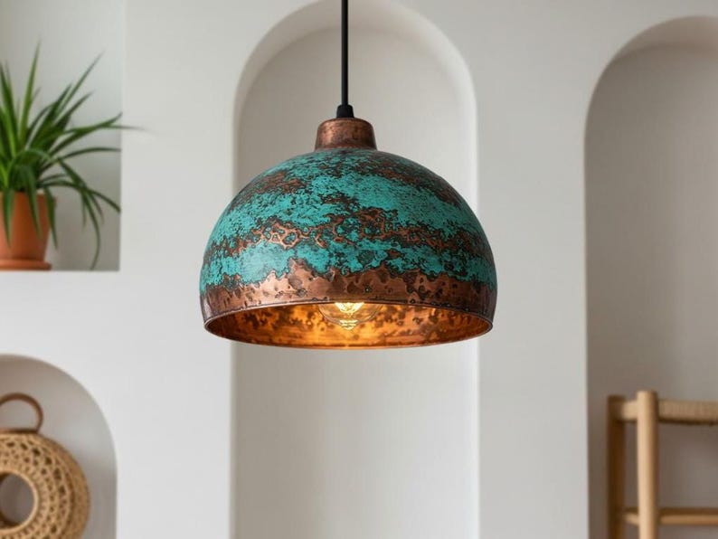 Add bold character to your space with this handcrafted copper dome pendant, featuring a rich verdigris patina layered over warm copper tones. The organic finish and glowing interior create a cozy, inviting ambiance—perfect for kitchens, dining areas, or modern rustic interiors. Each piece is uniquely aged for a one-of-a-kind look.