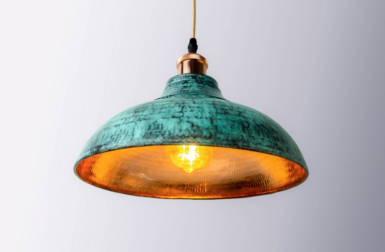 Verdigris Copper Pendant – Hammered Interior Rustic Dome Light