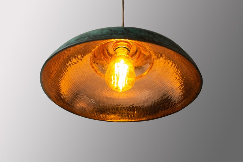 Add bold character to your space with this handcrafted copper pendant, featuring a rich verdigris patina exterior and a warm hammered copper interior. The wide dome shape delivers a soft, glowing light—perfect for kitchen islands, dining tables, or modern rustic interiors. Each piece is uniquely finished for a one-of-a-kind artisan look.