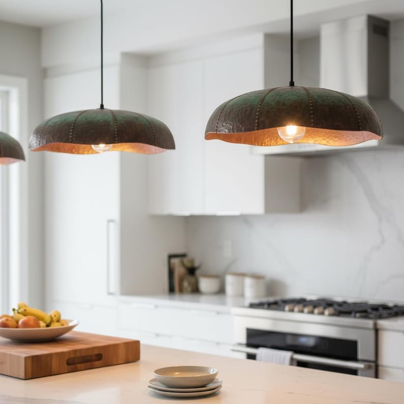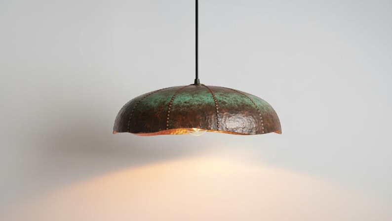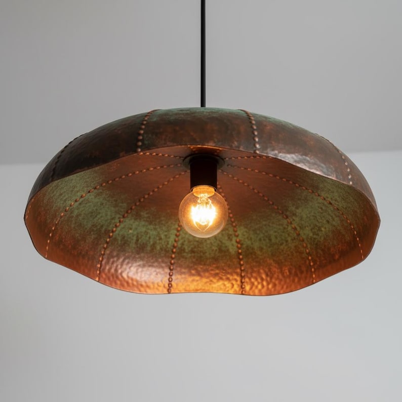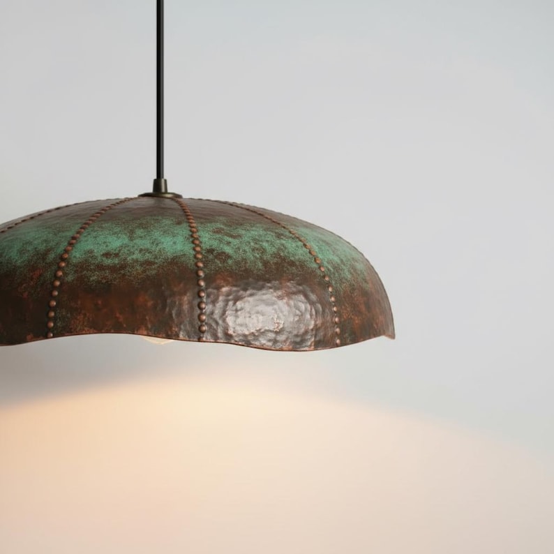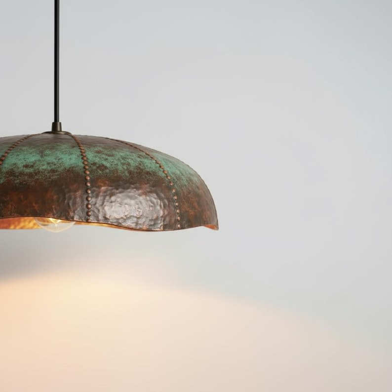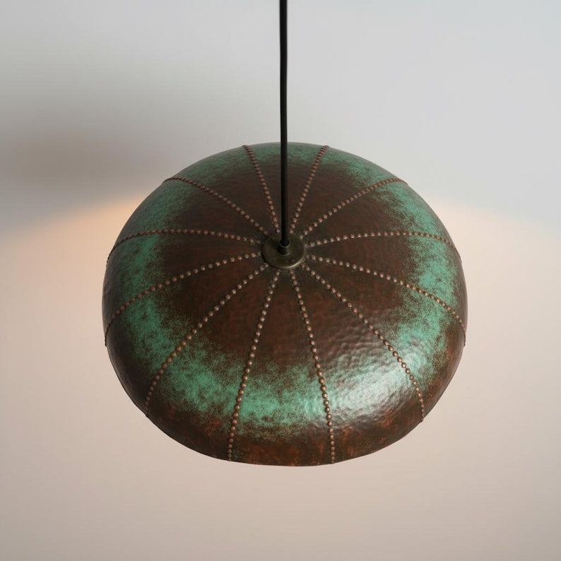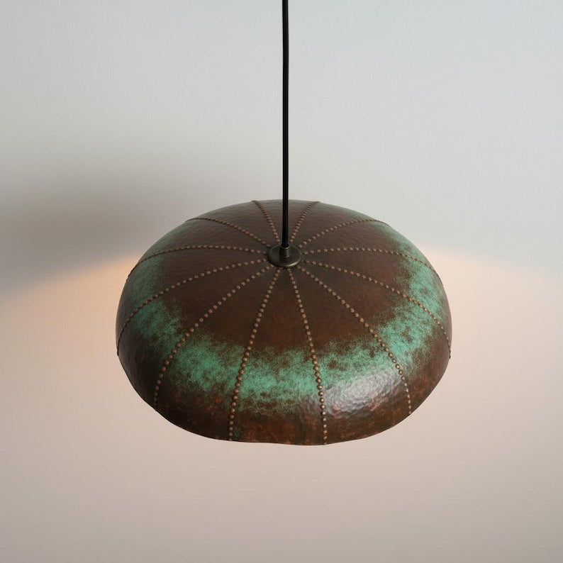 Upgrade your space with this handcrafted shallow dome copper pendant light, finished with a rich verdigris patina that adds depth and vintage charm. The low-profile dome shape keeps the design modern and clean, while the hand-finished patina creates natural variations that make each piece unique.