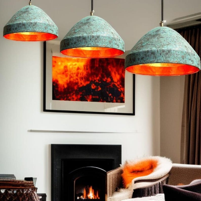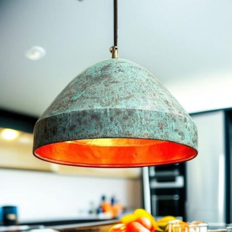 Make your space feel warm and elevated with this handcrafted verdigris patina copper pendant lamp. The modern cone-dome silhouette provides a clean designer look, while the hand-applied green-blue patina adds depth and natural variation—making each pendant truly one of a kind.