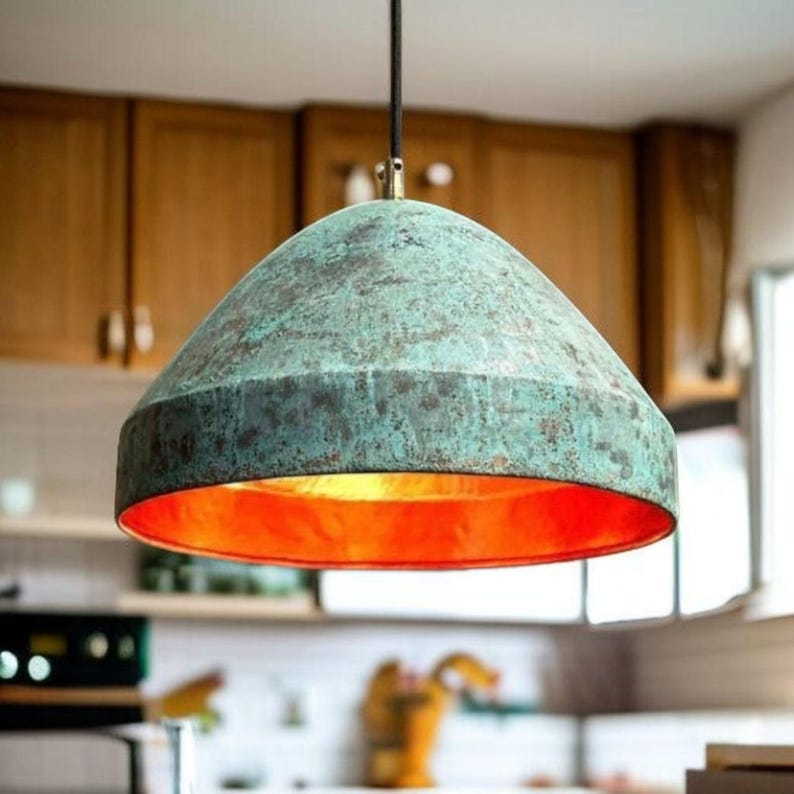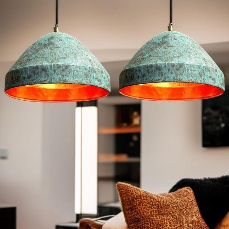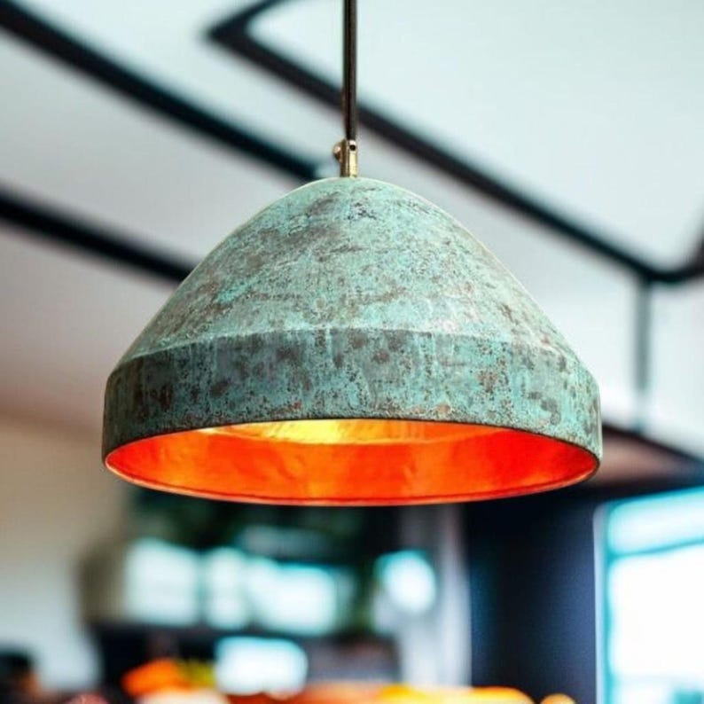 Verdigris Patina Copper Pendant Light – Handmade Modern Cone Dome Hanging Lamp