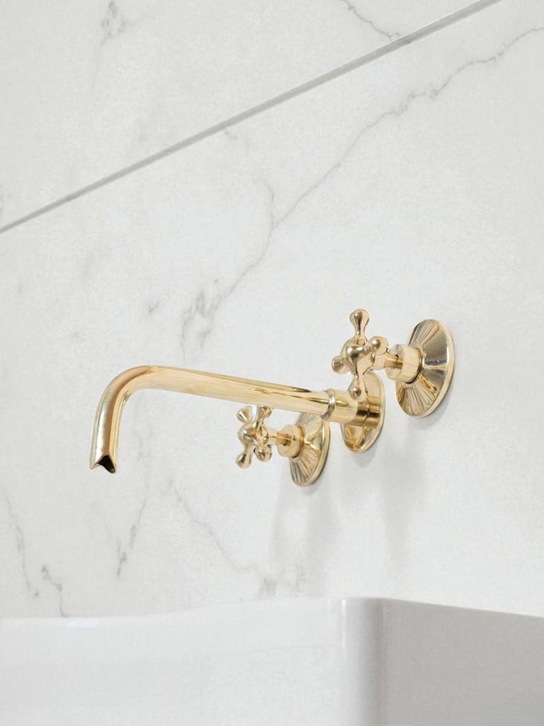 Enhance your bathroom with the refined elegance of this wall-mounted sink faucet, expertly made from solid unlacquered brass. Featuring a graceful 8-inch spout and a streamlined silhouette, it blends classic charm with modern simplicity. Over time, the raw brass finish develops a natural patina, giving each faucet a unique, timeworn character.