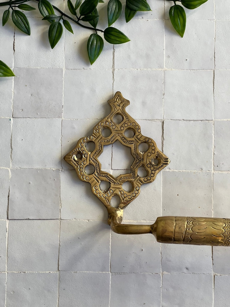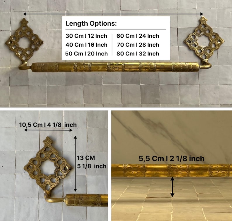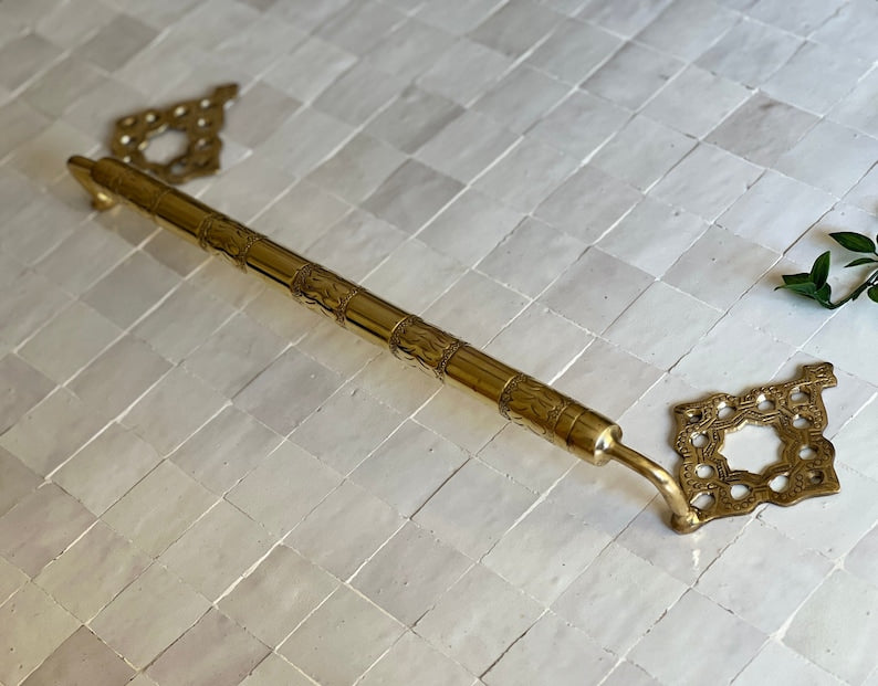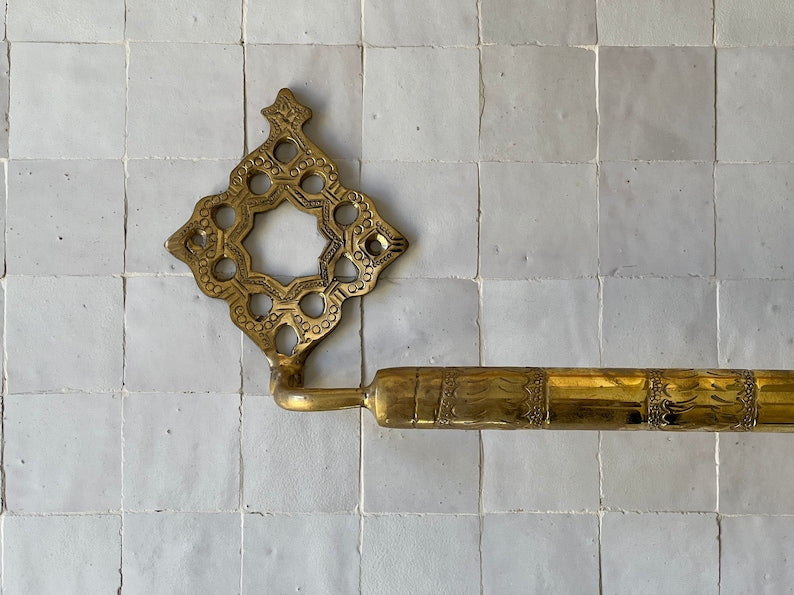 A core piece from our exquisite NEJMA bathroom accessories collection, This antique brass towel bar is cast and engraved through a 100% handmade process, making every piece a unique work of art that showcases the creativity and authenticity that Moroccan craftsmanship is known for.