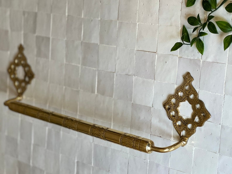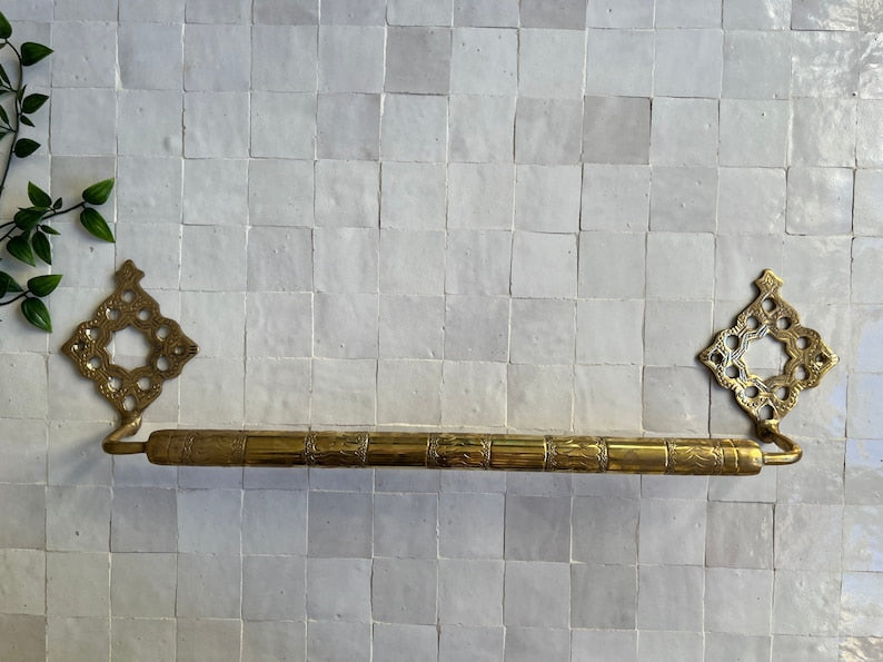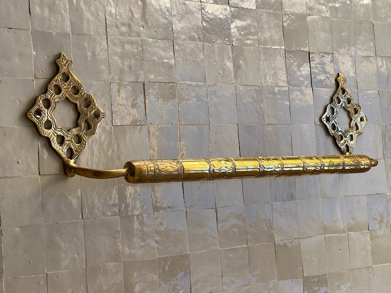 Brighten up your bathroom decor with our beautiful handmade Moroccan brass towel rail. This wall mounted towel holder is an elegant, sturdy, and functional piece of art designed to give your bathroom a stunning ambiance and unique farmhouse charm. The exquisite design of this brass towel holder is also a testament to the artisans' traditional craftsmanship and creativity.