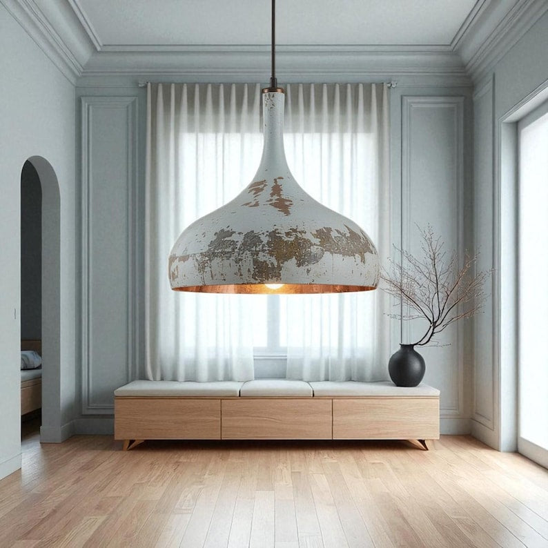 Its elegant dome shape makes it perfect for entryways, kitchen islands, dining tables, hallways, or living spaces. This pendant blends easily with farmhouse, coastal, Scandinavian, modern, and rustic interiors—adding a statement piece that still feels clean and timeless. Each light is handmade, so the distressed pattern will vary slightly, making every pendant unique.